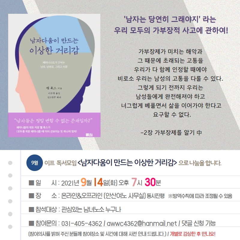 9월의 이프는 <남자다움이 만드는 이상한 거리감> 책으로 나눔합니다! 이프 소모임 회원이 아니더라도 누구나! 참여 가능합니다~!! 일시 : 9월 14일(화) 오후 7시 30분 장소 : 온라인 / 오프라인 동시