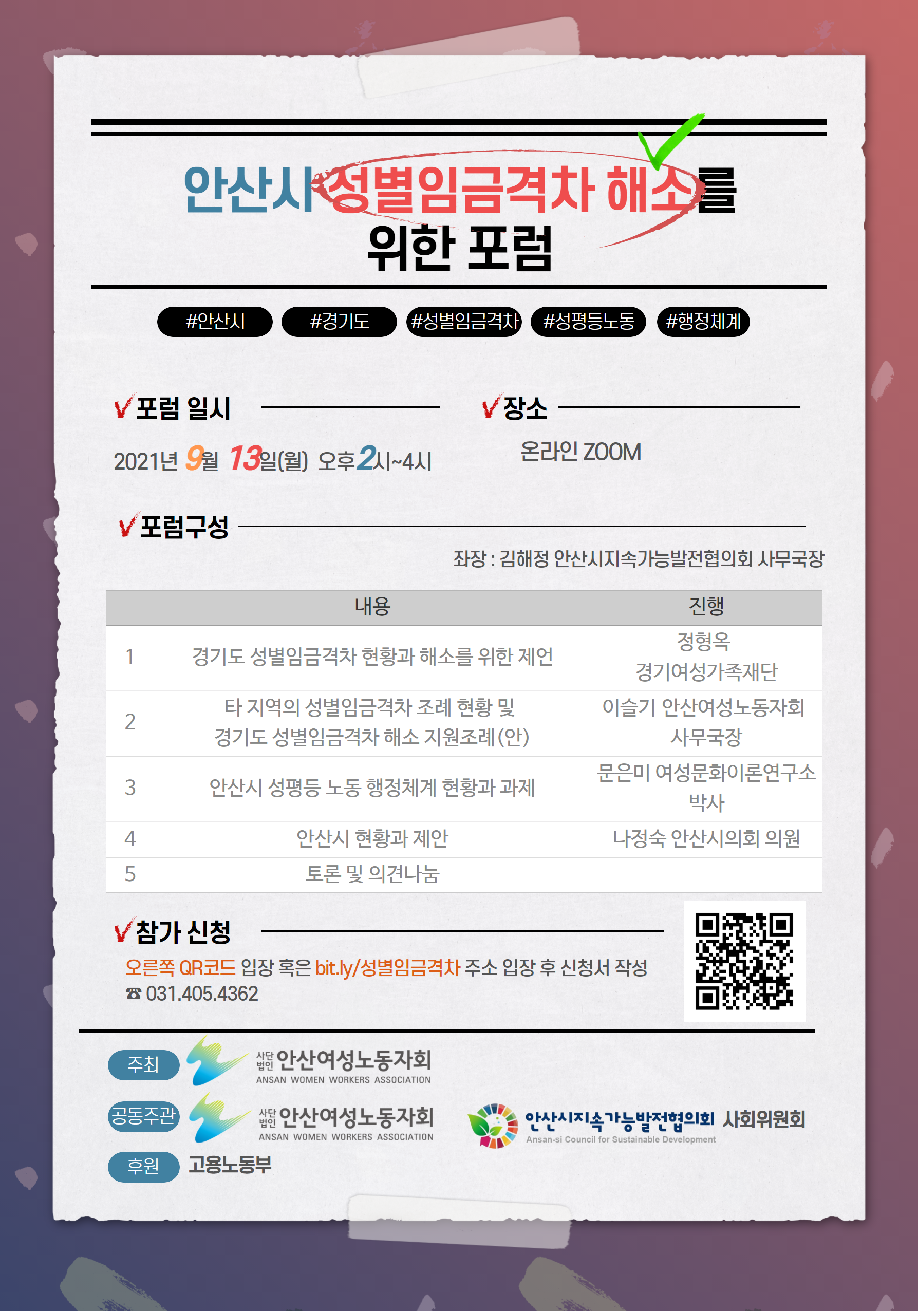 안산여성노동자회와 안산시지속가능발전협의회가 「안산시 성별임금격차 해소」를 주제로 포럼을 개최합니다.