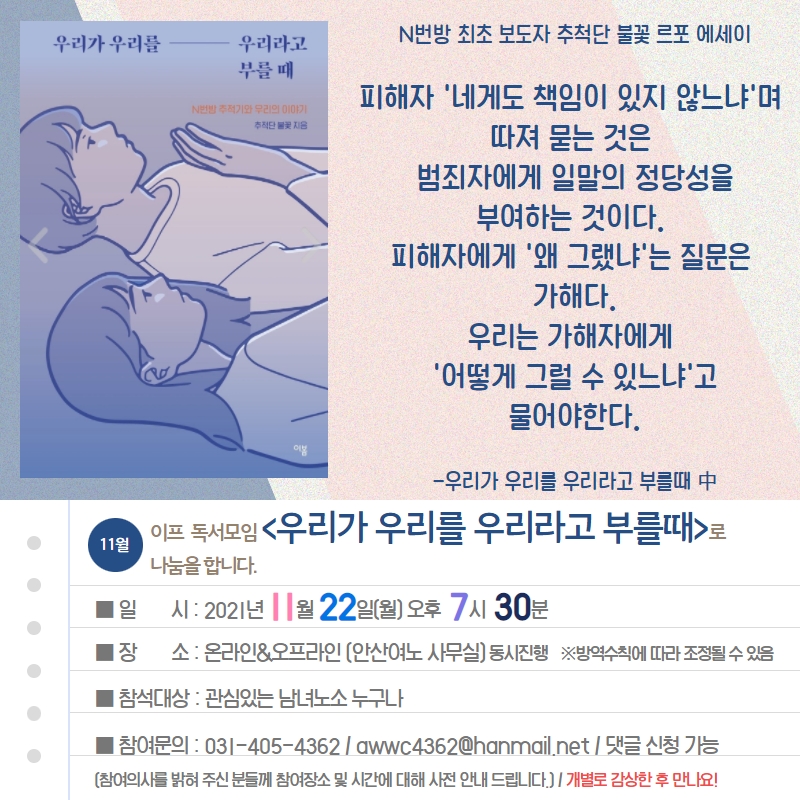 11월의 이프는 「우리가 우리를 우리라고 부를때」로 나눔을 합니다! <장소> 온/오프 진행. 방역수칙에 따라 조정될 수 있음 ●오프라인: 안산여노 사무실 안산시 단원구 와동로1길21, 보륭연립 1