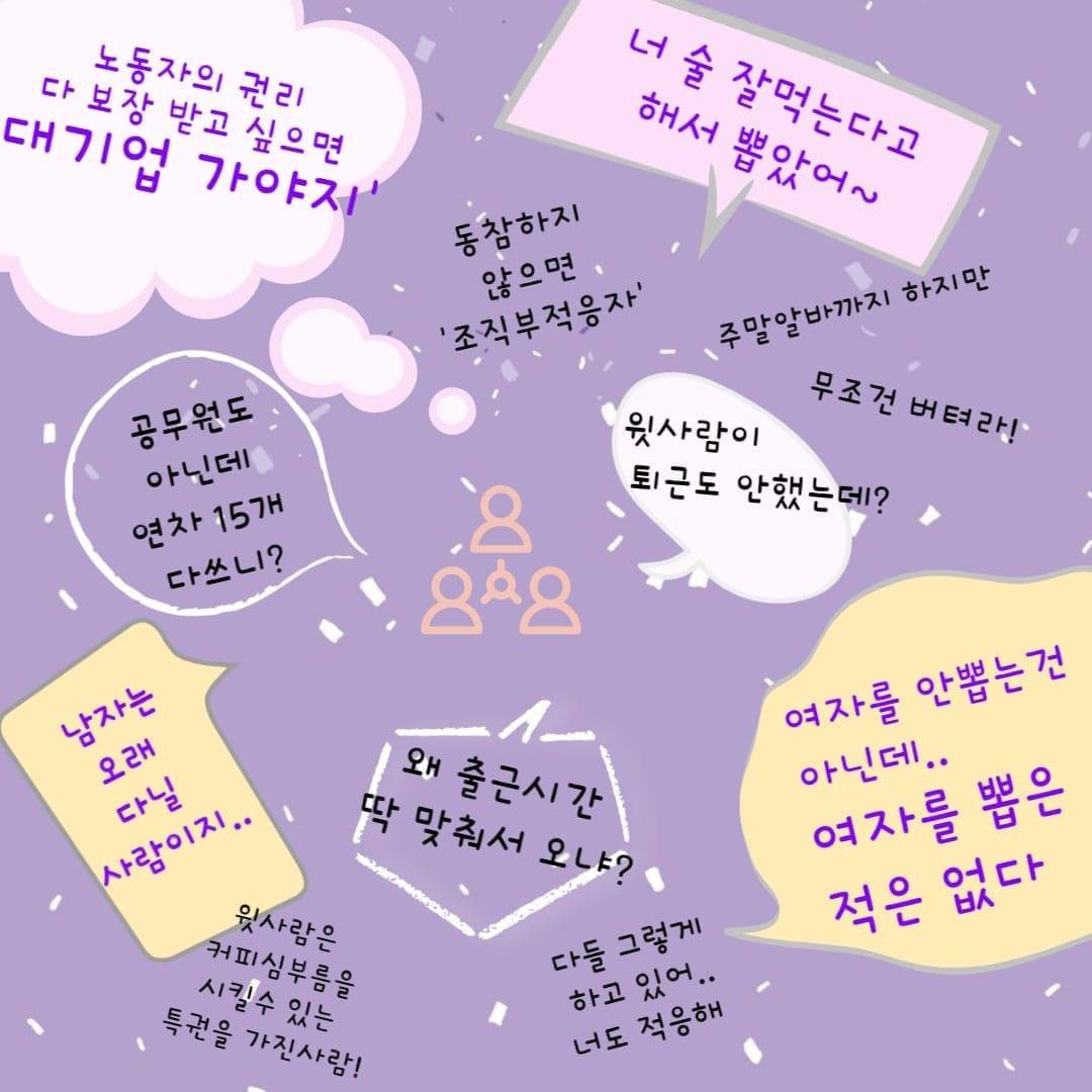 우리들은 열심히 공부했는데 전공을 살리지 못하고 여성중심 직종에서 일을 하기도 하고, 직장내 성희롱이나 성차별에 시달려 이직을 하기도 하고. 수평적 조직은 아니지만 그나마 월급이 밀리지 않는다는 사실에 안도하며 회사를 다니기도 하지. 네가 겪은 경험까지 생각한다면, 얼마나 많은 90년대생 여성 노동자들이 불안을 겪고 있는지 상상할 수 없어.