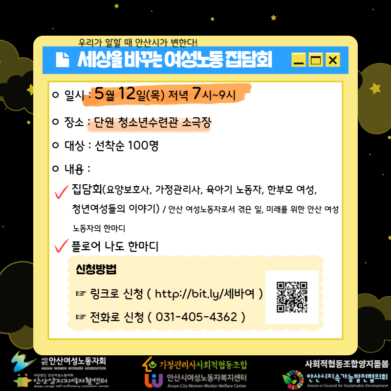 ∨주최·주관 : 안산여성노동자회, 가정관리사사회적협동조합, 사회적협동조합양지돌봄, 안산양지지역자활센터, 안산시여성노동자복지센터, 안산시지속가능발전협의회
