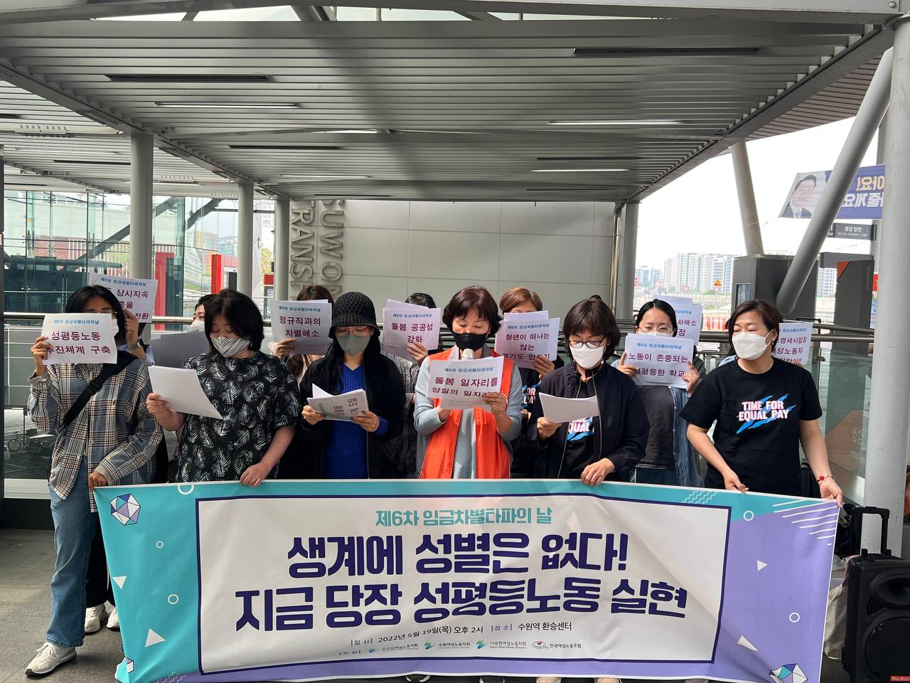 | ▣ 기자회견문 생계에 성별은 없다, 성평등 노동 실현에 경기도가 앞장서라! 5월 19일 제6차 임금차별타파의 날에 부쳐- 지난 5월 10일 윤석열 정부가 출범했다. 후보 시절부터 ‘구조적 성차별은 없다’며 한국사회의 절반인 여성을 삭제하고, 노동을 배제하며 차별과 혐오를 조장해 온 새 정부의 등장에 우리 여성노동자는 우려를 금할 수가 없다. 당선 이후 행보로 보아도 여성가족부를 없애고, 노동시간을 늘리고, 최저임금을 동결하고, 질 나쁜 일자리를 양산하겠다는 반여성, 반노동의 공약을 충실히 지킬 것으로 보인다. 이러한 상황에서 치러지는 6월 1일 지방선거를 맞아 우리 여성노동자들은 지방정부부터 성평등 노동을 실현하고, 이를 통해 중앙정부를 견인할 것을 촉구하며 오늘 기자회견에 나섰다. 오늘, 5월 19일은 제6차 임금차별타파의 날이다. 임금차별타파의 날은 남성정규직 임금대비 여성비정규직의 임금 격차를 드러내 한국사회의 심각한 성별임금격차와 여성노동의 불안정성을 알리고 이를 타파하고자 제정되었다. 2021년 기준 남성정규직의 평균임금은 383만 원, 여성비규직의 평균임금은 145만 원으로 남성정규직 노동자의 임금을 100이라 할 때 여성비정규직 노동자의 임금은 37.9%에 불과하며, 이를 1년으로 환산하면 여성비정규직 노동자는 5월 19일 이후부터 대가 없는 무급노동을 하고 있는 셈이다. 코로나19 재난 이후 여성노동자들은 가장 많이 타격을 받았고, 가장 오래 위기에 놓여 있다. 여성노동자 중 비정규직은 52.3%로 절반이 넘고, 4명 중 1명은 저임금노동자이다. 재난 상황 속 여성노동자에게 가중된 위기, 여성노동자의 저임금, 비정규직 집중 현상은 성차별이 구조적으로 존재한다는 것을 방증하는 것이다. 매년 OECD 1위를 기록하는 한국사회의 성별임금격차는 단지 성별로 인해 나뉘는 업종·직무, 비정규직에 집중되는 고용형태, 채용부터의 차별, 승진제한 등의 복합적 결과이다. 이러한 노동시장에서의 성차별을 해소하기 위한 정부와 지자체의 성평등 정책이 어느 때보다 절실하다. 2019년 경기도 성별임금격차는 35.9%로 이러한 성별임금격차는 여성들이 노동시장에서 얼마나 차별을 겪고 있는지 차별의 결과를 명확히 보여준다. 이 같은 문제가 지속되는 가장 큰 원인은 노동시장의 성차별적 구조에 있다. 성차별적 노동시장의 구조를 바꾸고 성평등 노동이 실현될 수 있도록 지방선거를 앞두고 경기도에 필요한 정책을 제안하고자 한다. 첫째, 성평등 노동 추진체계를 요구한다. 현재 경기도에서 성평등 노동을 전담하는 부서는 부재하다. 최근 중앙정부가 주도적으로 추진해온 노동정책을 지방정부의 역할과 책임성이 강조되면서 경기도도 지난 민선7기 이재명전도지사가 노동정책 전담부서를 설치하여 다양한 노동정책을 추진하고 있으나 채용과정에서부터 부서배치, 교육훈련의 기회와 승진 등 노동생애 전반에 걸쳐 작동되는 구조적 성차별을 해소하기 위한 추진체계가 없는 실정이다. 이에 성평등 노동 부서를 신설하고 충분한 인력과 예산 배치가 되어야 한다. 그리고 성평등 노동 정책을 개발하고, 기획, 실행하는 업무를 실행할 수 있는 전문가가 정확히 있어야 하며 경기도지사 직속 성평등 노동 위원회를 신설 경기도 성평등 노동 사안을 적극적으로 해결해 나가야 한다. 둘째, 성별임금격차 해소 조례 제정과 성평등 공시제를 시행해야 한다. 지난해 6월 기획재정위원회에 ‘경기도 성별임금격차 개선 조례안’이 상정되었으나 실효성 문제로 부결된 바 있다. 부결이유는 공공기관은 임금상 성차별이 없다는 이유였는데 실제로 2020년 성별 임금 현황을 공시한 정부 산하 369개 공공기관의 근로자 1인당 평균임금의 성별격차를 조사한 결과 남성 1인당 평균임금은 7760만원인데 비해 여성 1인당 평균임금은 5610만원으로 공공기관 근로자 1인당 평균임금의 성별격차는 27.8%로 나타났다. 공공기관은 임금상 성차별이 없다고 하는 말이 무색할 정도다. 무엇보다 공시제를 통해 드러낸 격차에 대한 심각성을 인지하고 문제 해결을 위한 방안을 수립하여 사업장 내 합의를 끌어내는 단계적 과정을 밟아야 한다. 셋째, 돌봄공공성을 강화하고 돌봄 일자리를 양질의 일자리로 만들어 돌봄권을 강화해야 한다. 지난 민선7기 이재명전도지사의 공약에서 경기도는 보육의 공공성 강화를 위해 일하는 모든 부모가 걱정 없이 자녀를 돌볼 수 있도록 프리랜서나 플랫폼 노동, 특수고용이나 비정규직 등 불안정한 일자리의 노동자들도 육아휴직을 사용할 수 있게 하겠다고 밝혔다. 하지만 일하는 부모들이 걱정 없이 자녀를 돌보기는 아직 어려운 현실이다. 공공 돌봄시설을 확충해야 함은 물론 무엇보다 돌봄 노동자가 안정적으로 일할 수 있어야 양질의 돌봄이 가능하다. 지방정부는 돌봄 노동자에게 처우개선비 지급과 점차적으로 월급제를 도입하고, 안정적 고용, 안전한 노동환경 제공 등을 통해 양질의 돌봄을 만들어가야 한다. 또한 경기도 여성가족국 안의 ‘일 가정 지원과’라는 부서명은 여전히 여성은 ‘가정’ 즉 돌봄을 축으로 하여 여성의 일을 규정하고 있다는 점에서 수정되