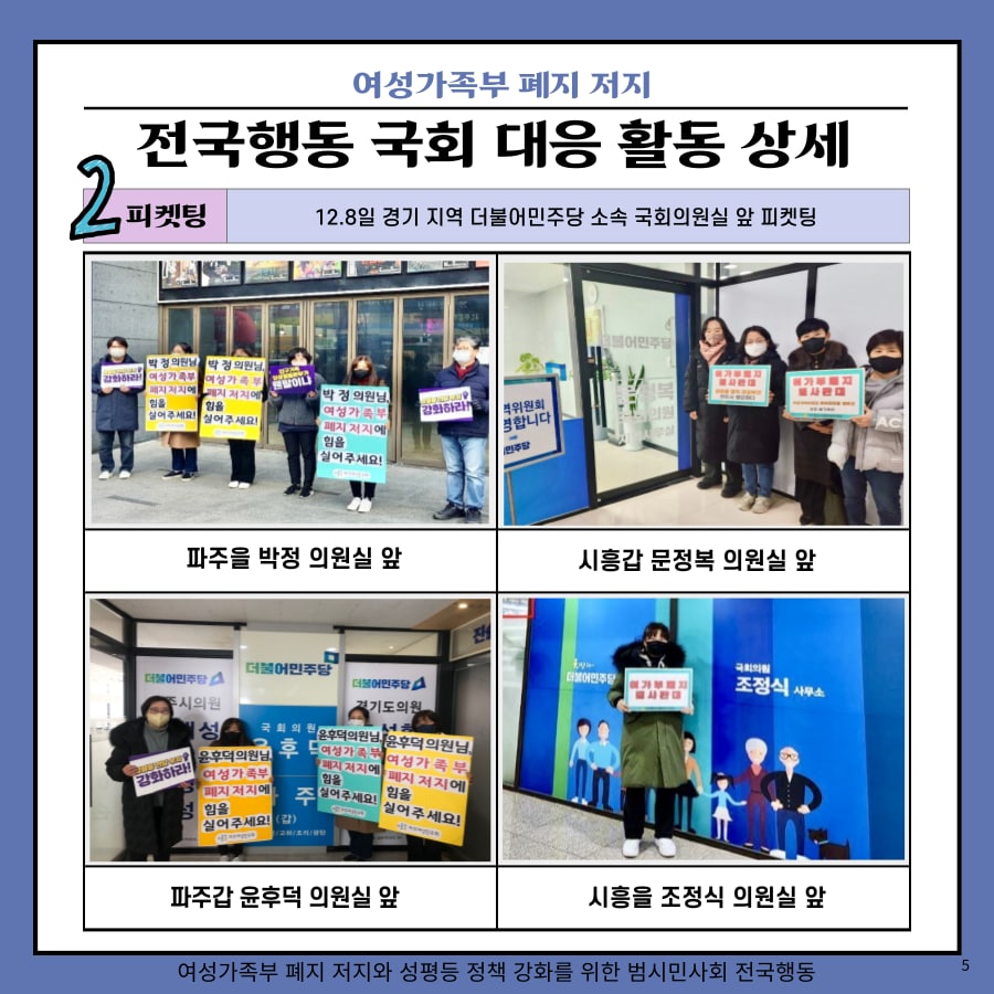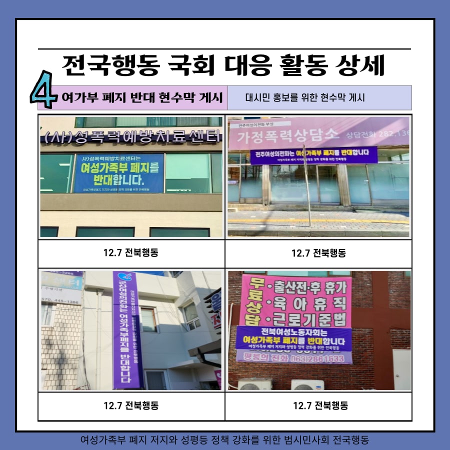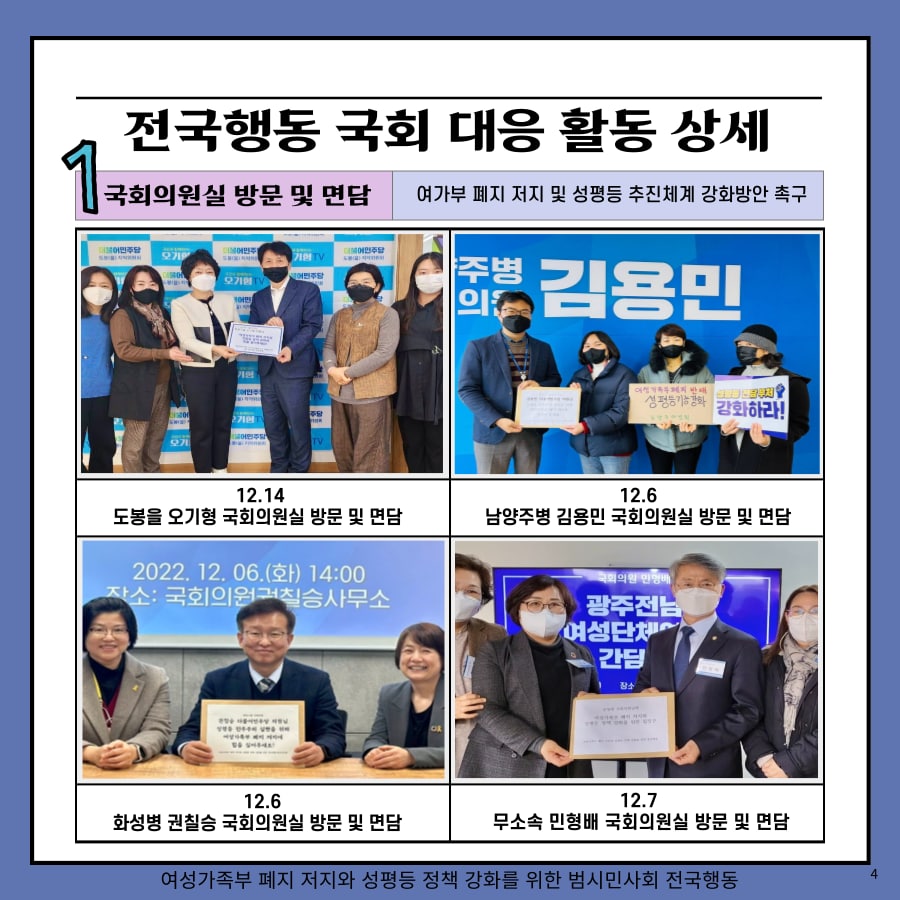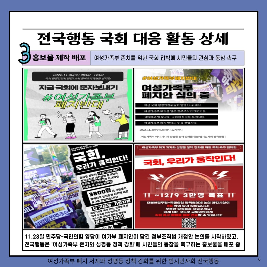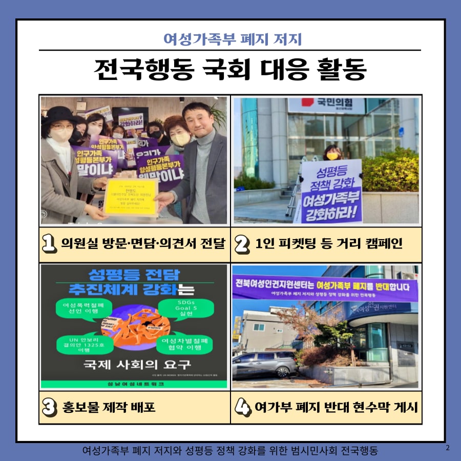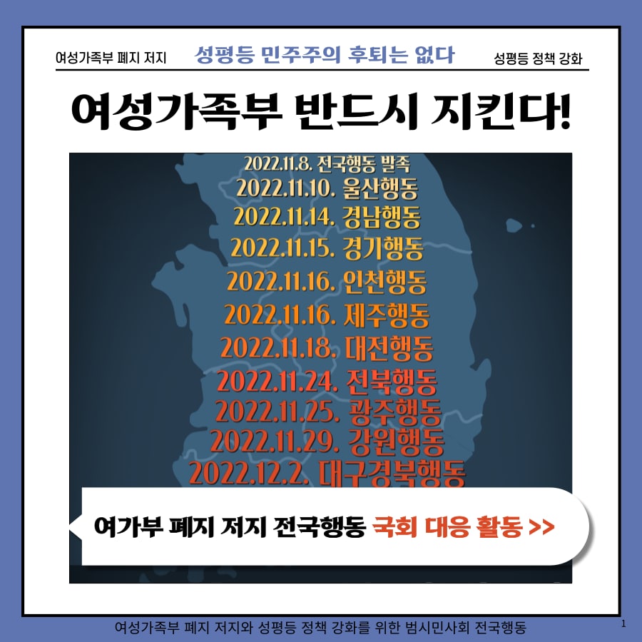 - 민주당-국민의힘 양당이 여가부 폐지안이 담긴 정부조직법 개정안 논의를 정책협의체에서 시작하였고, 전국행동은 ‘여성가족부 존치와 성평등 정책 강화’에 시민들의 동참을 촉구하는 홍보물을 배포 중