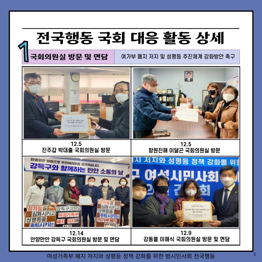 - 민주당-국민의힘 양당이 여가부 폐지안이 담긴 정부조직법 개정안 논의를 정책협의체에서 시작하였고, 전국행동은 ‘여성가족부 존치와 성평등 정책 강화’에 시민들의 동참을 촉구하는 홍보물을 배포 중