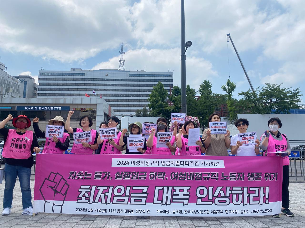 | 제8차 여성비정규직 임금차별타파 주간 기념 기자회견 치솟는 물가, 실질임금 하락, 여성비정규직 노동자 생존 위기! 최저임금 대폭 인상하라!! ○ 주최 : 전국여성노동조합, 전국여성노동조합 서울지부, 한국여성노동자회, 서울여성노동자회 ○ 사회 : 전국여성노동조합 모윤숙 사무처장 ○ 프로그램 : - 발언1 : ‘나의 최저임금’ 설문조사 발표 (한국여성노동자회 박선영 정책연구위원) - 발언2 : 물가인상과 실질임금 하락 체감, 최저임금 대폭 인상하라 (전국여성노동조합 서울지부 서강대 청소노동자 윤미순 분회장) - 발언3 : 우리의 임금이 올라야 성별임금격차 해소한다 (전국여성노동조합 고용노동부지부 안양고객상담센터 상담원 김연은) - 발언4 : 업종별 차등지급 반대한다 (가사·방문 돌봄노동자 김상은, 서울여성노동자회 오순옥 대독) - 발언5 : 최저임금 적용확대 (전국여성노동조합 디지털콘텐츠창작노동자지회 정화인 사무장) - 기자회견문 낭독 - 퍼포먼스: 치솟는 물가, 실질임금 하락, 늘어나는 생활비 대출 삼중고에 쓰러지는 여성노동자 |