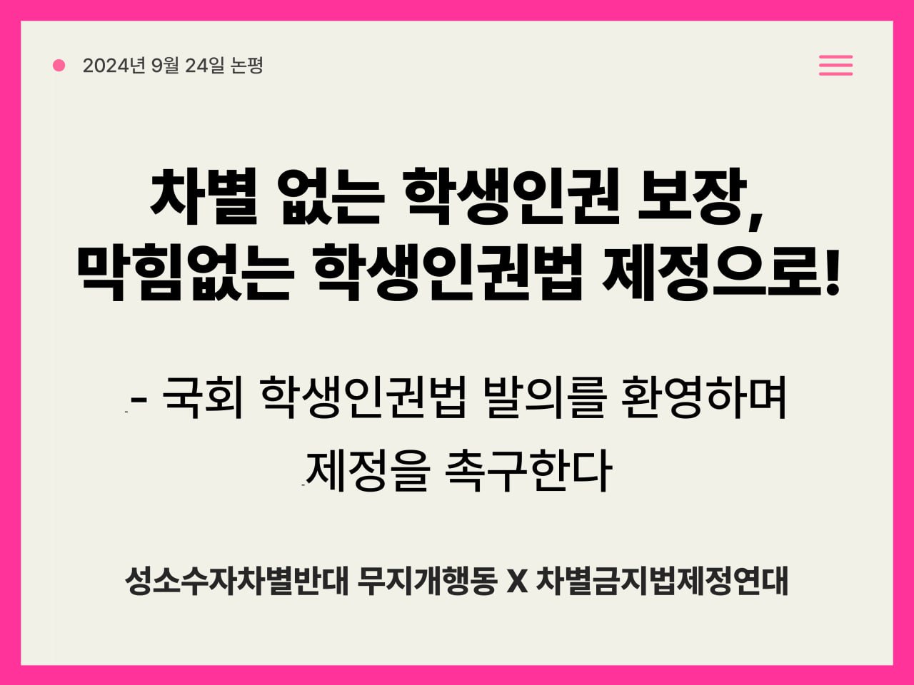 학생도 시민이다. 학생은 차별받지 않고 교육받을 권리가 있으며, 교육의 주체로 존중받아야 한다. 학생인권법 제정은 이러한 기본선을 만드는 일이다. 22대 국회는 차별 없는 학생인권 보장, 막힘없는 학생인권법 제정으로 권리보장의 책임을 다하라.