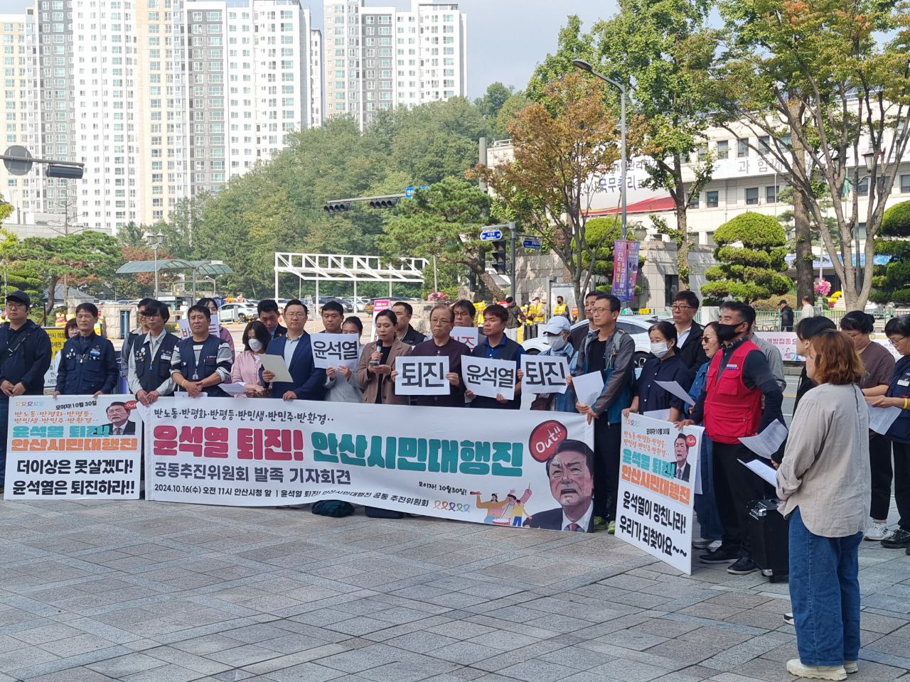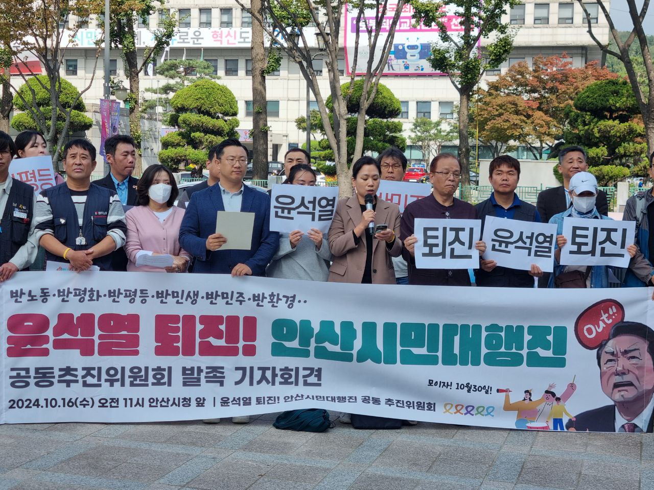 박범수 진보당 안산지역위원회 위원장은 “윤석열 정권의 지지가 20%로 바닥을 치고 있다.”며 “지난 총선에서 국민이 윤석열 정권에 경고했지만 윤석열 정권은 끝내 국민의 목소리를 듣지 않았다.”고 말했다. 또, “안보 불안, 민생경제 파탄, 김건희 여사의 국정농단 등 이대로는 못 살겠다.”고 말하고 있다며, “이제 시민들이 비감한 각오로 나서야 한다.”고 말했다. 이어 10월 30일 ‘윤석열 퇴진 안산시민대행진’에 집중해달라고 호소했다.