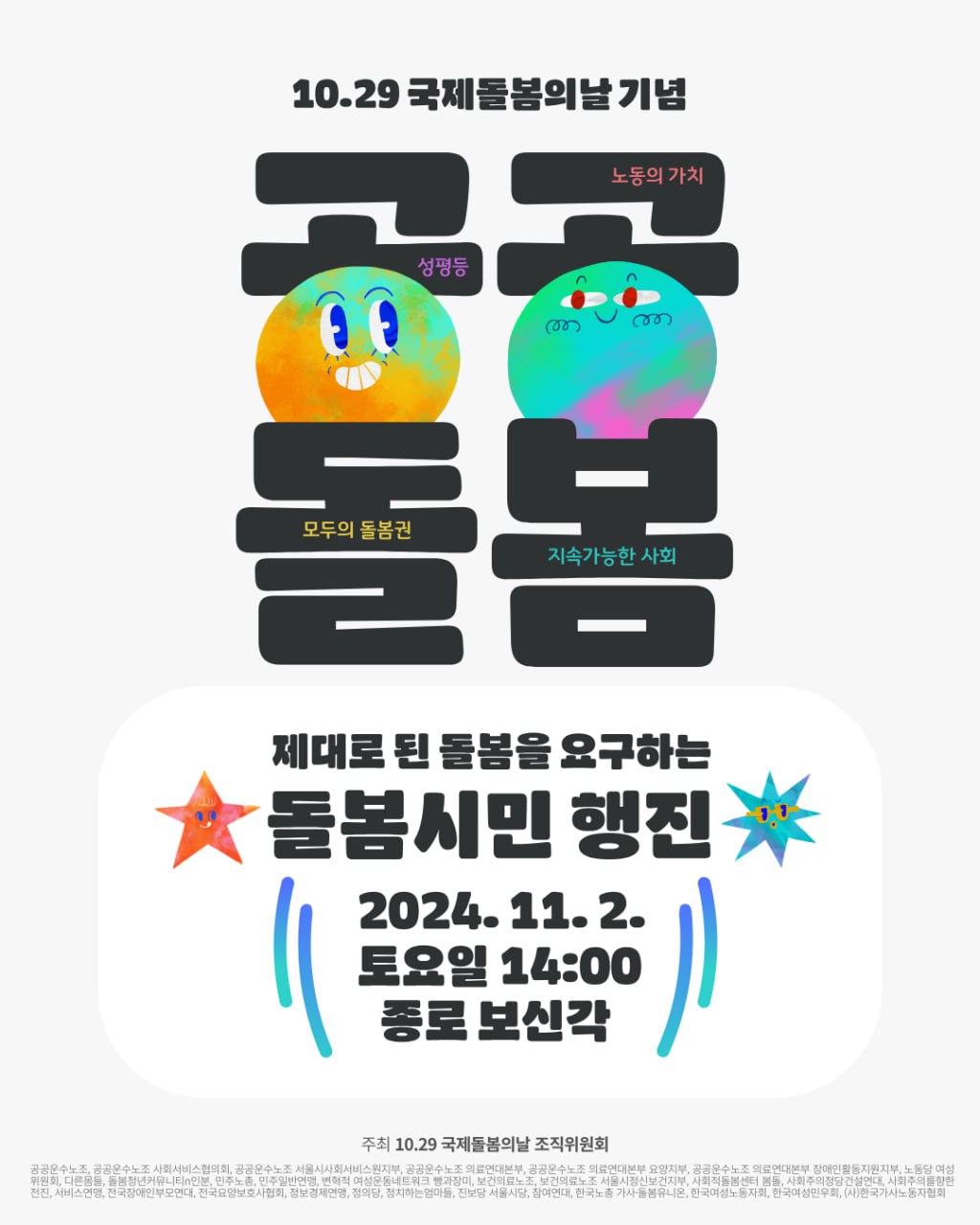 오는 10월 29일은 '국제돌봄과 지원의 날'입니다. 총 29개의 노동시민사회단체들은 국제돌봄과 지원의 날을 맞이하여 10월 28일부터 11월 2일까지를 "10.29 돌봄의 날 주간"으로 선포하고 다양한 행사를 개최할 예정입니다. 돌봄노동 가치 재평가와 처우개선, 돌봄의 공적 책임 강화를 위한 이번 돌봄의 날 주간에 함께해주세요!