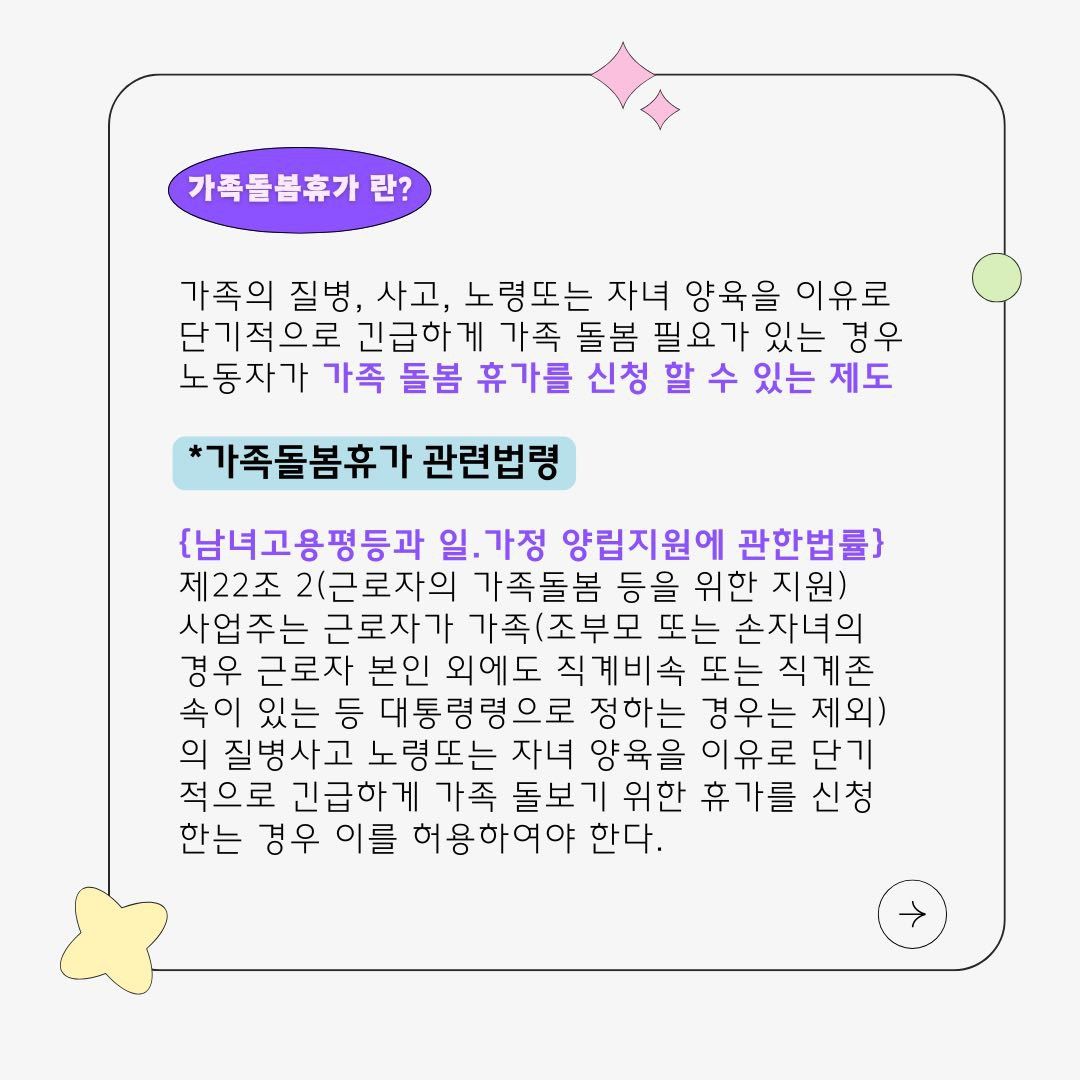 ◽ 가족돌봄휴가 관련법령 {남녀고용평등과 일ㆍ가정 양립지원에 관한 법률}