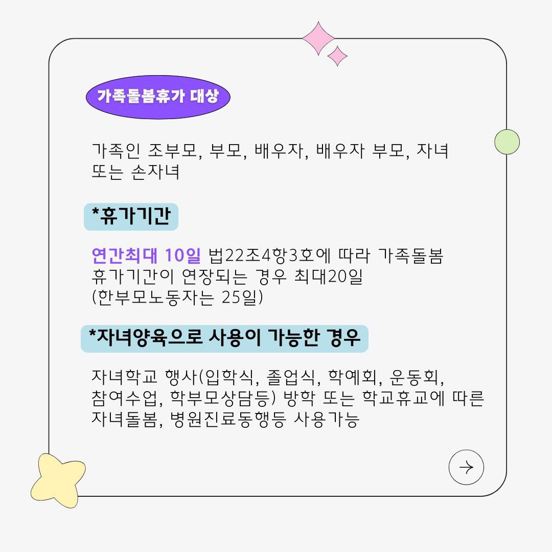 휴가기간 : 연간최대 10일 법22조 4항 3호에 따라 가족돌봄휴가기간이 연장되는 경우 최대20일 (한부모 노동자는 25일)