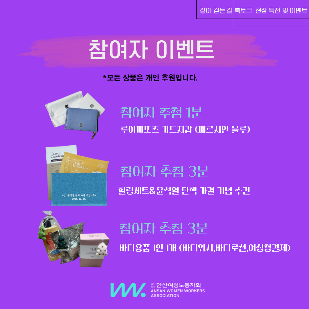 선물도 받고 이벤트도 참여해서 경품도 타가며 따뜻하고 아늑하며 즐거운 북토크를 듣고 이야기 나누며 맛있는 음식들과 차를 먹으며 따뜻한 연말을 보내는 건 어떨까요?