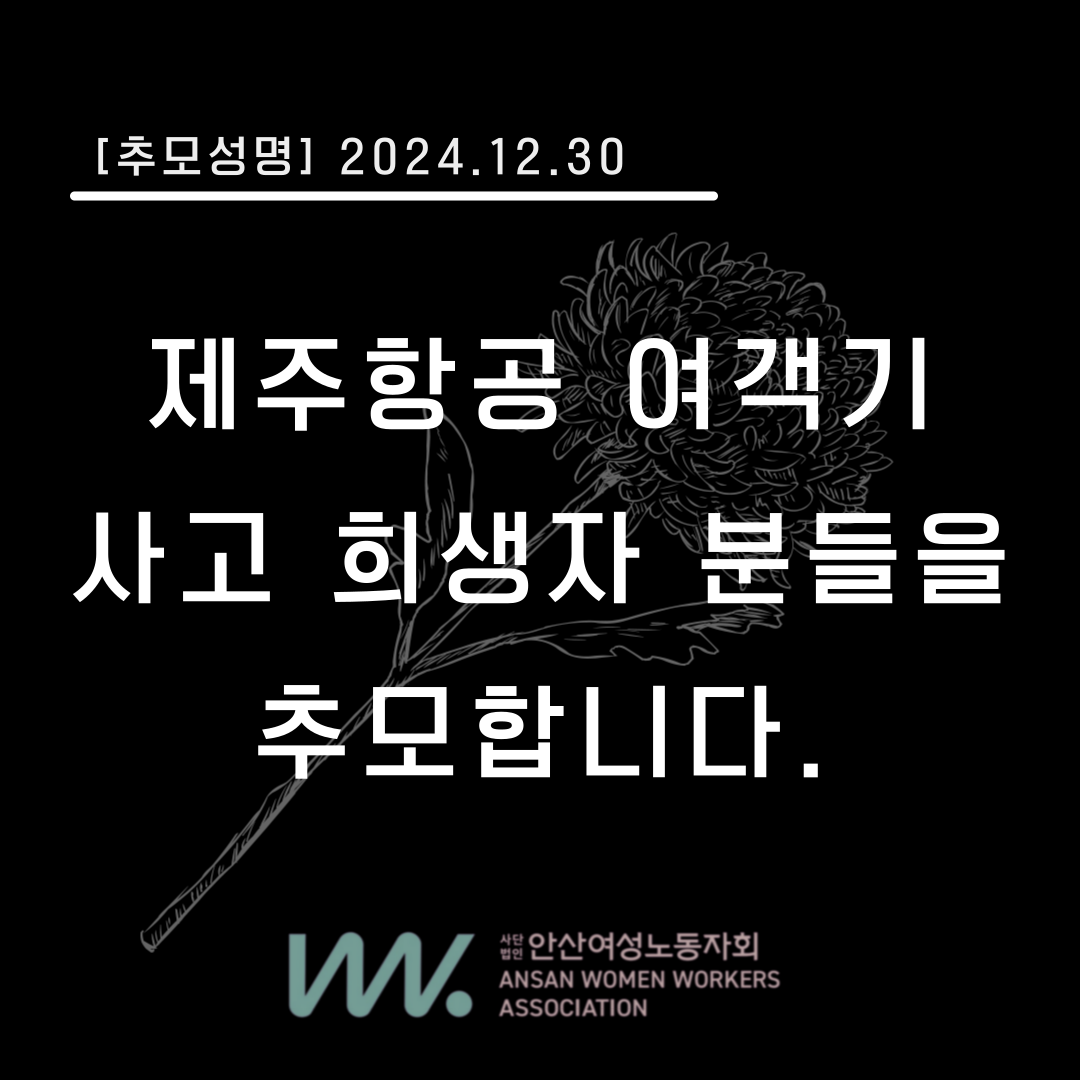 2024년 12월 29일, 무안국제공항에서 181명의 탑승객을 태운 제주항공 여객기가 추락하였습니다. 이번 참사로 인해 수많은 사망자들이 발생하였음에 참담하고 비통함을 느낍니다. 갑작스러운 참사로 희생되신 승객분들과, 노동자로서 마지막까지 자신의 책임을 다하고자 했을 승무원들께 안타까움을 전합니다.