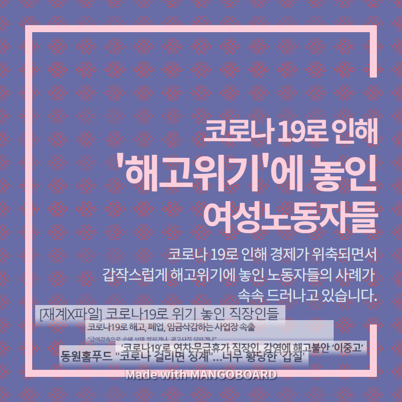 | [카드뉴스]코로나19, 간접고용 여성노동자에게 불어닥친 해고위기 (2) | 2020.06.18 |