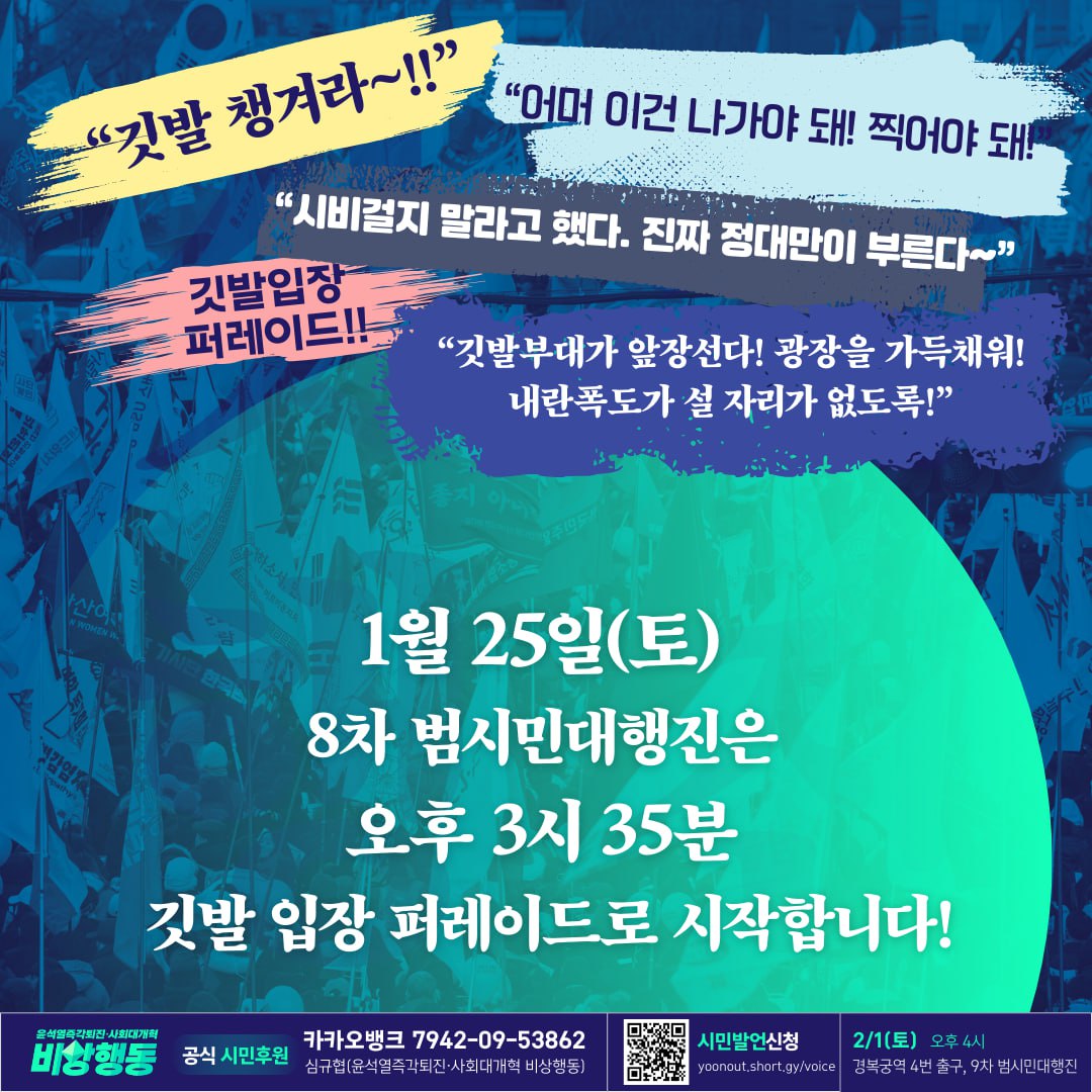 1월 25일(토) 윤석열즉각퇴진‧사회대개혁 비상행동 범시민대회는 오후 3시35분 깃발입장 행진으로 시작합니다!