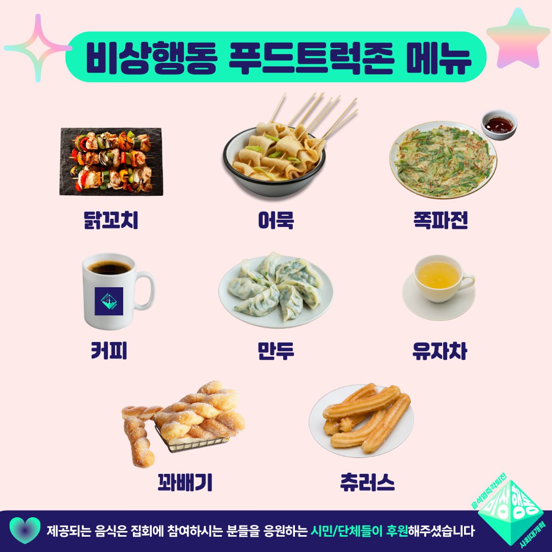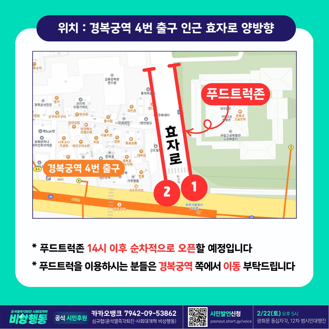 📍 효자로 양방향(경복궁역 인근)에 푸드트럭존이 14시 이후 오픈할 예정입니다. 집회에 참가하시는 분들은 마음껏 이용해주세요!