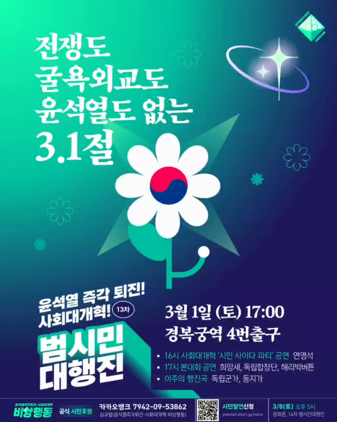 전쟁도, 굴욕외교도, 윤석열도 없는 3.1절을 같이 만들기 위해 광장에 모여주세요!