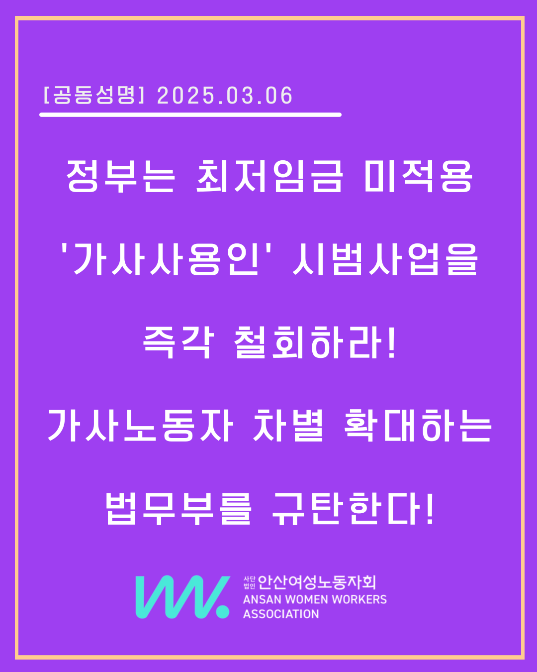 정부는 근로기준법 11조, 가사사용인 적용 제외조항을 악용하여 ‘외국인 가사사용인 시범사업’을 본격 추진하고 있다. 근로기준법 11조 1항에 '가사사용인 적용제외'로 규정돼있어, 가사노동자들은 노동자임에도 가사사용인이라는 애매한 용어로 불리며 최저임금, 휴가제도 등 모든 근로기준법에서 배제되어왔다. 정부는 이를 악용하여 “합리적 비용”이라는 명분을 앞세워 이주가사돌봄노동자에게 최소한의 노동권도 보장되지 않는 ‘외국인 가사사용인 시범사업’을 진행하려 하고 있다. 지난해 6월 19일 저출산고령사회위원회는 저출생 추세 반전을 위한 대책으로 외국인 유학생(D-2), 외국인근로자의 배우자(F-3) 등에 가사돌봄 활동을 허용하는 시범사업, 민간기관이 해외의 사용 가능한 가사사용인을 합리적 비용으로 도입·중개·관리할 수 있도록 하는 제도 도입 방안을 검토하겠다고 발표한 바 있다. 그리고 지난 2일 한겨레 보도를 통해 법무부 예산안에서 ‘외국인 가사사용인 활용 직무교육’을 위한 강사료로 3억원이 반영되었음이 알려졌다. 사실상 이 시범사업이 추진되고 있음이 확인된 셈이다. 이는 이주가사돌봄노동자를 법적 보호의 울타리 밖으로 밀어내고, 최저임금조차 보장되지 않는 착취적 노동환경을 합법화하려는 반인권적 정책이다.