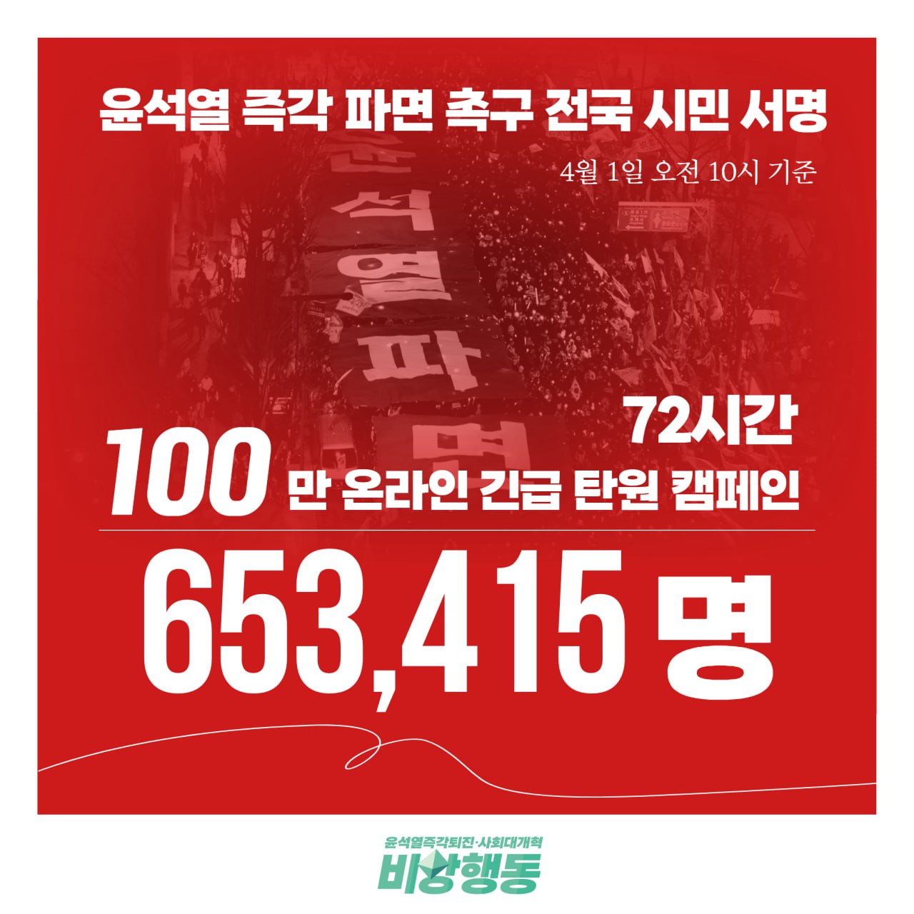 100만 시민의 요구를 헌재에 전달하기 위해 탄원에 함께 해주세요. 35만 명의 참여가 더 필요한 지금, 소식을 주변에 알리고 동참을 독려해주세요. 윤석열 파면, 우리의 손으로 이뤄냅시다.