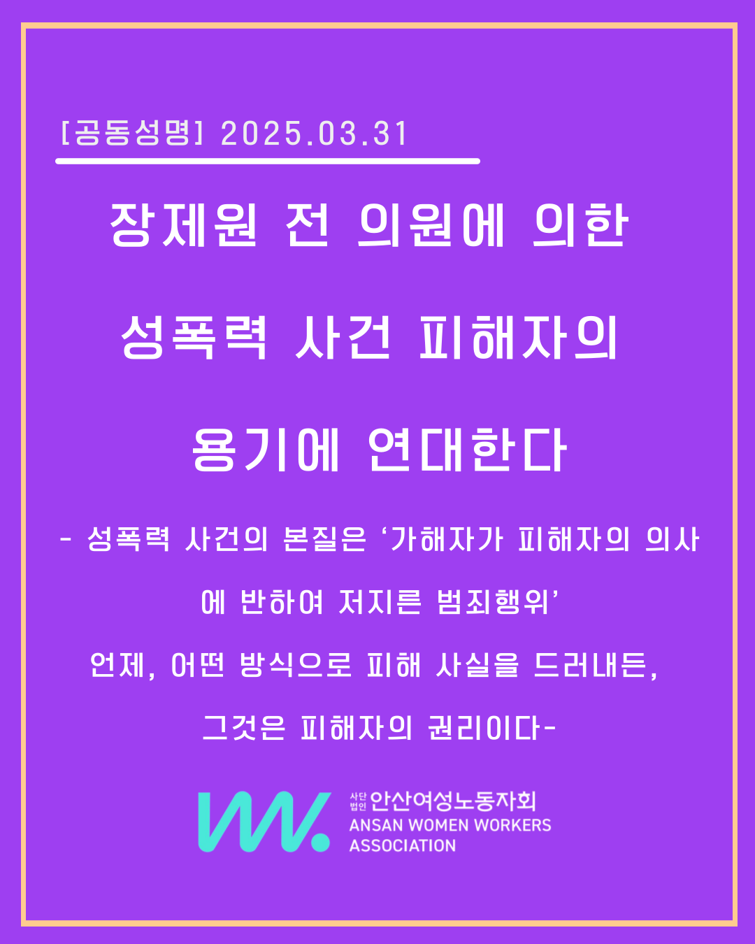 [공동성명] - 성폭력 사건의 본질은 ‘가해자가 피해자의 의사에 반하여 저지른 범죄행위’ 언제, 어떤 방식으로 피해 사실을 드러내든, 그것은 피해자의 권리이다- <장제원 전 의원에 의한 성폭력 사건 피해자의 용기에 연대한다>