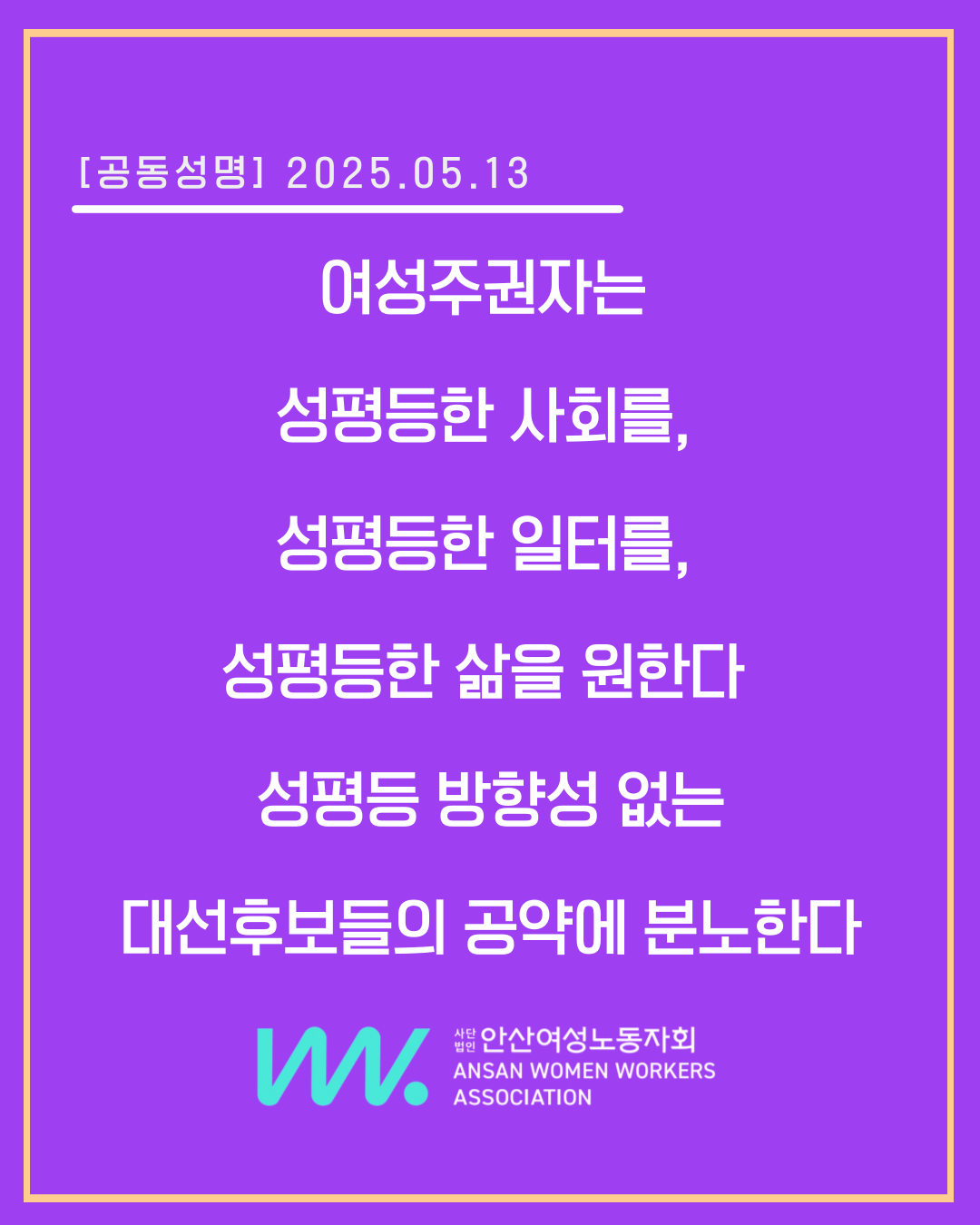지난 겨울, 대한민국 시민들은 차별과 혐오, 폭압 정치를 행하던 대통령을 탄핵하고 파면하였다. 내란수괴 윤석열이 훼손한 것은 헌법과 민주주의, 성평등, 그리고 시민의 삶 그 자체였다. 시민들은 내란수괴 윤석열의 징치를, 정의와 평등, 민주주의 실현을 요구하였다. 광장의 빛은 더 나은 세상을 바라는 열망으로, 정의로운 세상에 대한 소망으로 타올랐다. 민주시민의 손으로 1년 6개월 앞당긴 조기 대통령 선거다. 후보들은 이전의 과오와 문제점들을 분명하게 개선하고 한발 더 나아간 민주주의 실현과 시민들이 행복한 세상을 약속해야 한다.