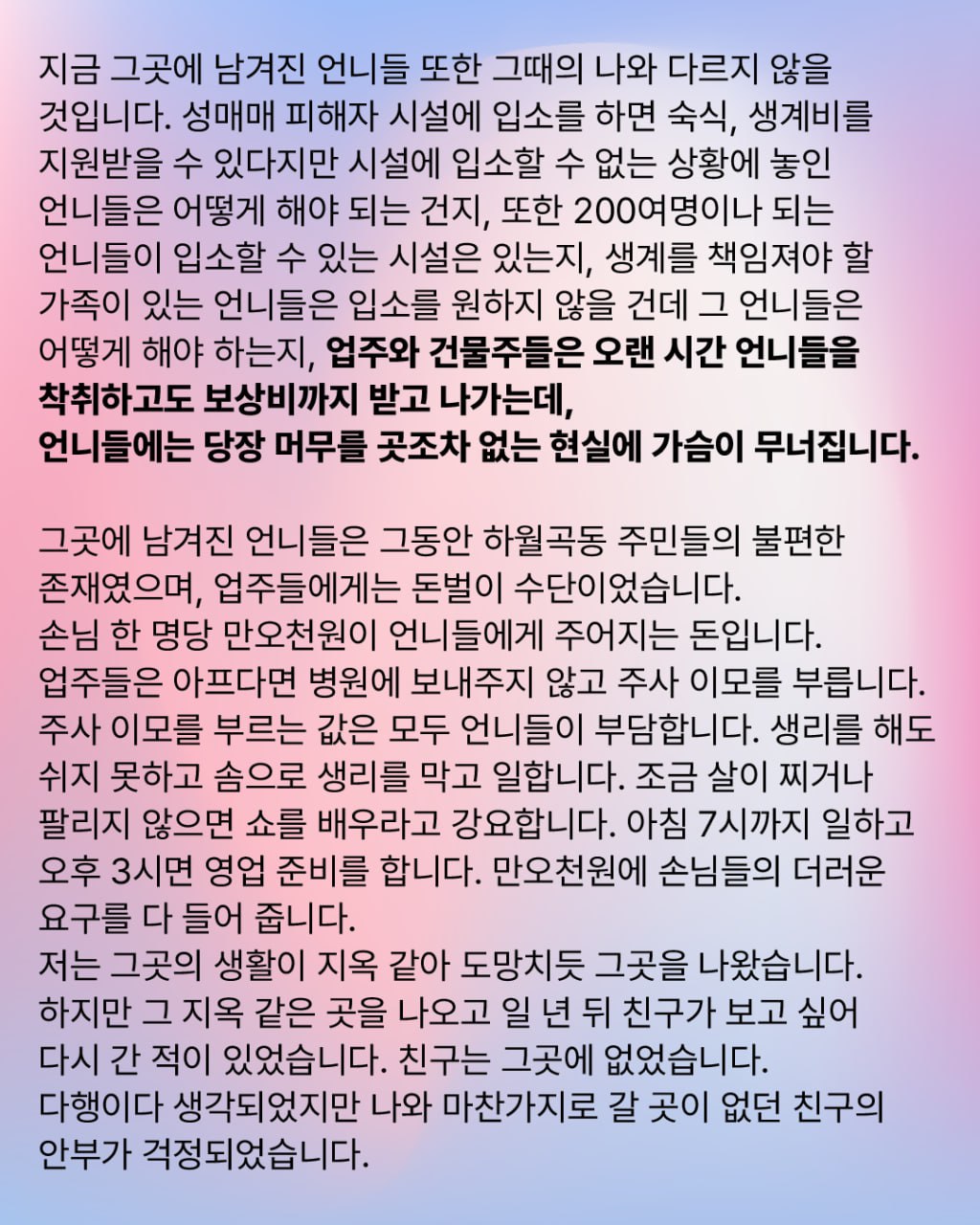 여성들이 쫓겨나는 것이 아니라, 삶에 희망을 품고 미아리를 떠날 수 있게 도와주세요