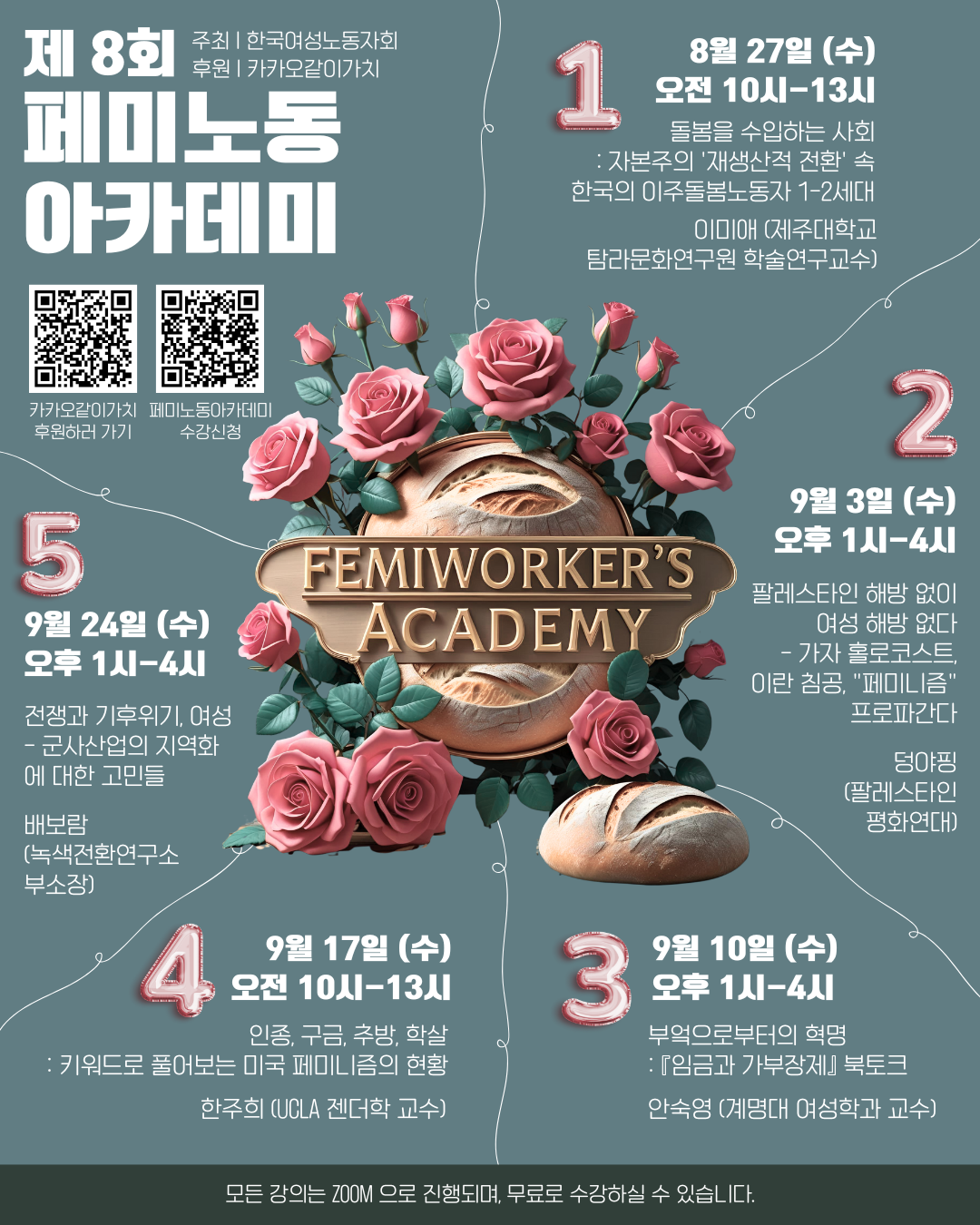 전쟁과 테러의 위협, 극우와 혐오세력의 부상이 글로벌 위기로 나타나는 지금, <제 8회 페미노동아카데미>는 이를 '여성노동'과 '페미니즘'의 관점으로 바라보고자 합니다. <제 8회 페미노동아카데미>는 현실을 진단하고 대안을 상상하는 연대의 장이 될 것입니다.