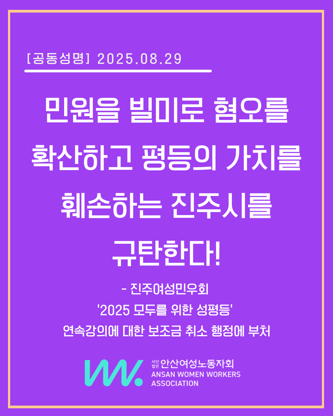 - 진주여성민우회 ‘2025 모두를 위한 성평등’ 연속강의에 대한 보조금 취소 행정에 부쳐