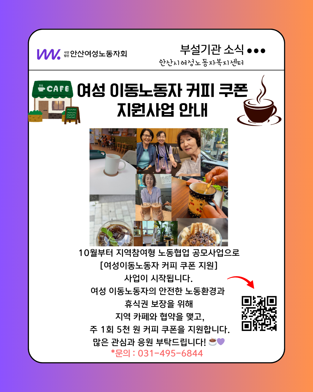 안산시여성노동자복지센터: 여성 이동노동자 커피 쿠폰 지원사업(10월 시작, 주 1회 5천원 쿠폰)