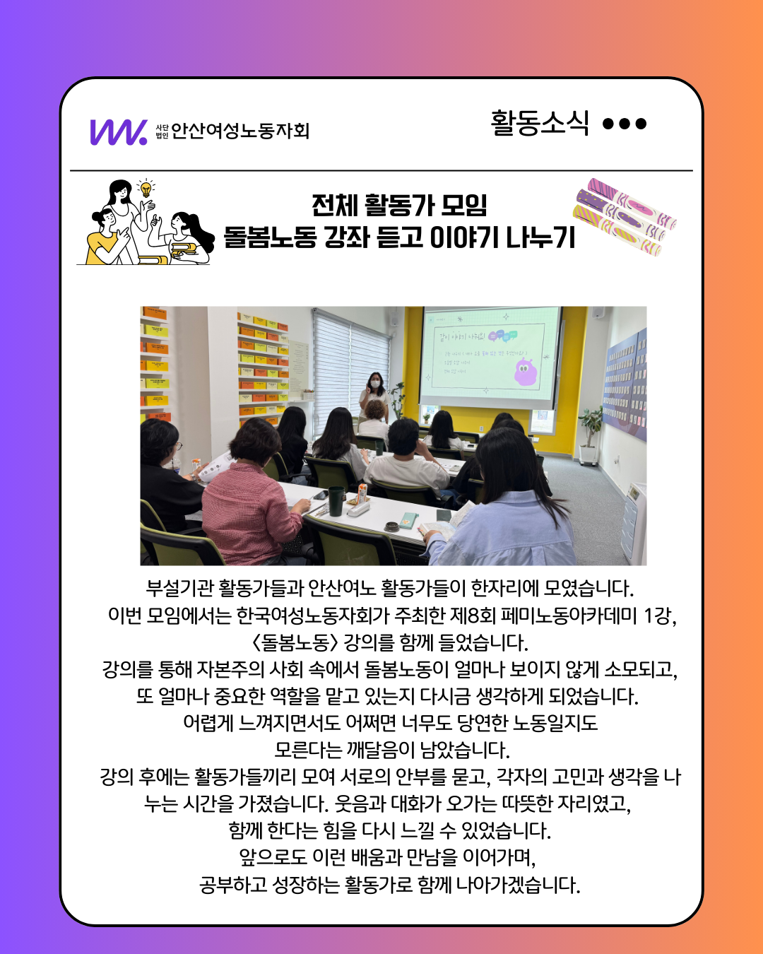 돌봄노동의 가치와 가려진 현실을 돌아보고, 활동가들 간 안부와 고민을 나누는 따뜻한 자리 였습니다!