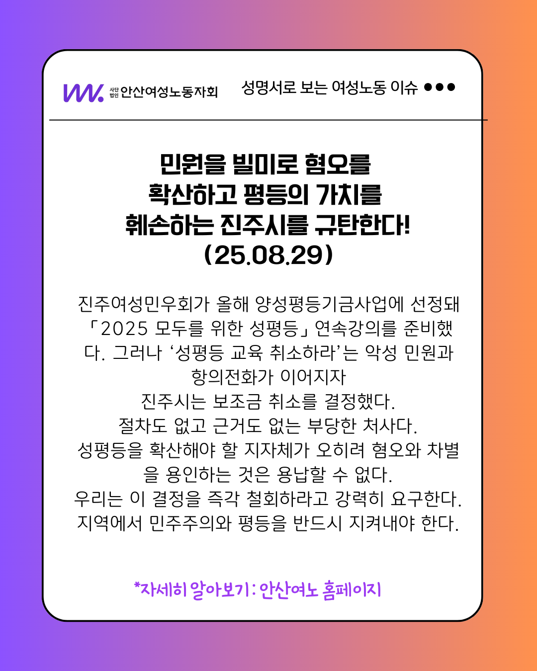 진주여성민우회 성평등 강의 보조금 부당 취소 사태 규탄.