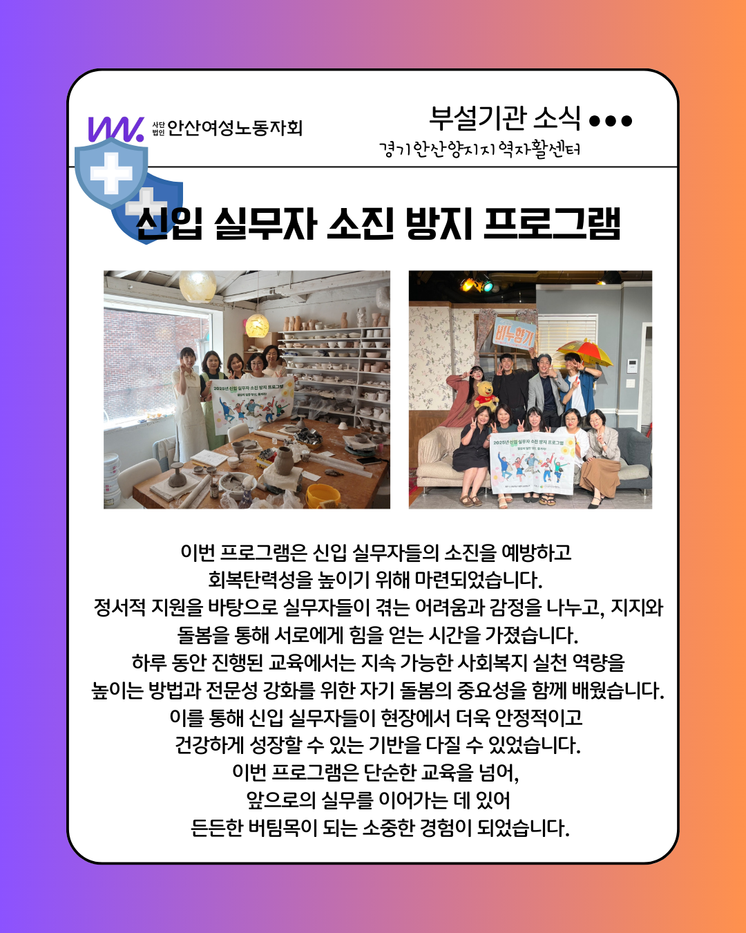 경기안산양지지역자활센터: 서클교육(관계·공감·협력적 공동체), 신입 실무자 소진 방지 프로그램 운영.