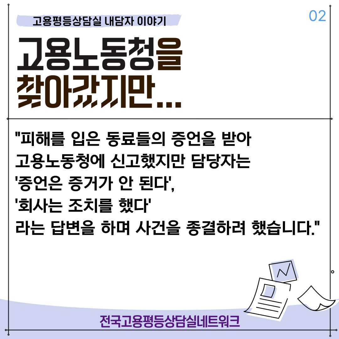"피해를 입은 동료들의 증언을 받아 고용노동청에 신고했지만 담당자는 '증언은 증거가 안 된다', '회사는 조치를 했다' 라는 답변을 하며 사건을 종결하여 했습니다."