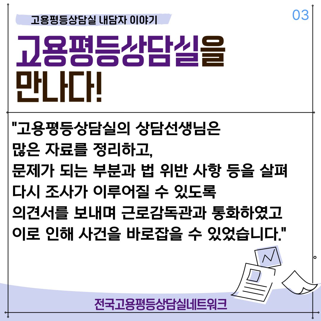 "고용평등상담실의 상담 선생님은 많은 자료를 정리하고, 문제가 되는 부분과 법 위반 사항 등을 살펴 다시 조사가 이루어질 수 있도록 의견서를 보내며 근로감독관과 통화하였고, 이로 인해 사건을 바로잡을 수 있었습니다."