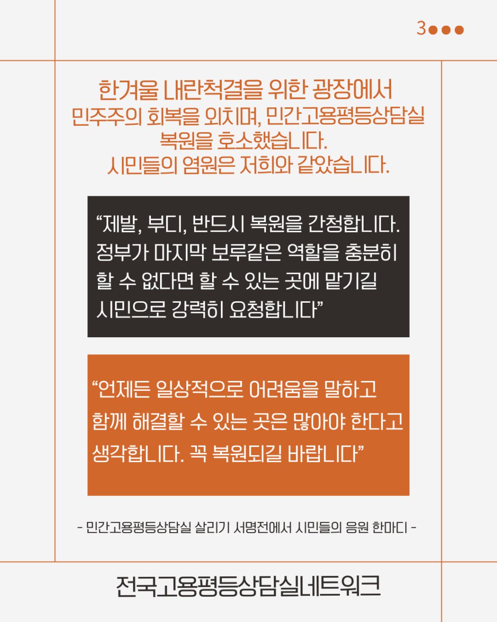 한겨울 내란척결을 위한 광장에서 민주주의 회복을 외차며, 민간고용평등상담실 복원을 호소했습니다. 시민들의 염원은 저희와 같았습니다.