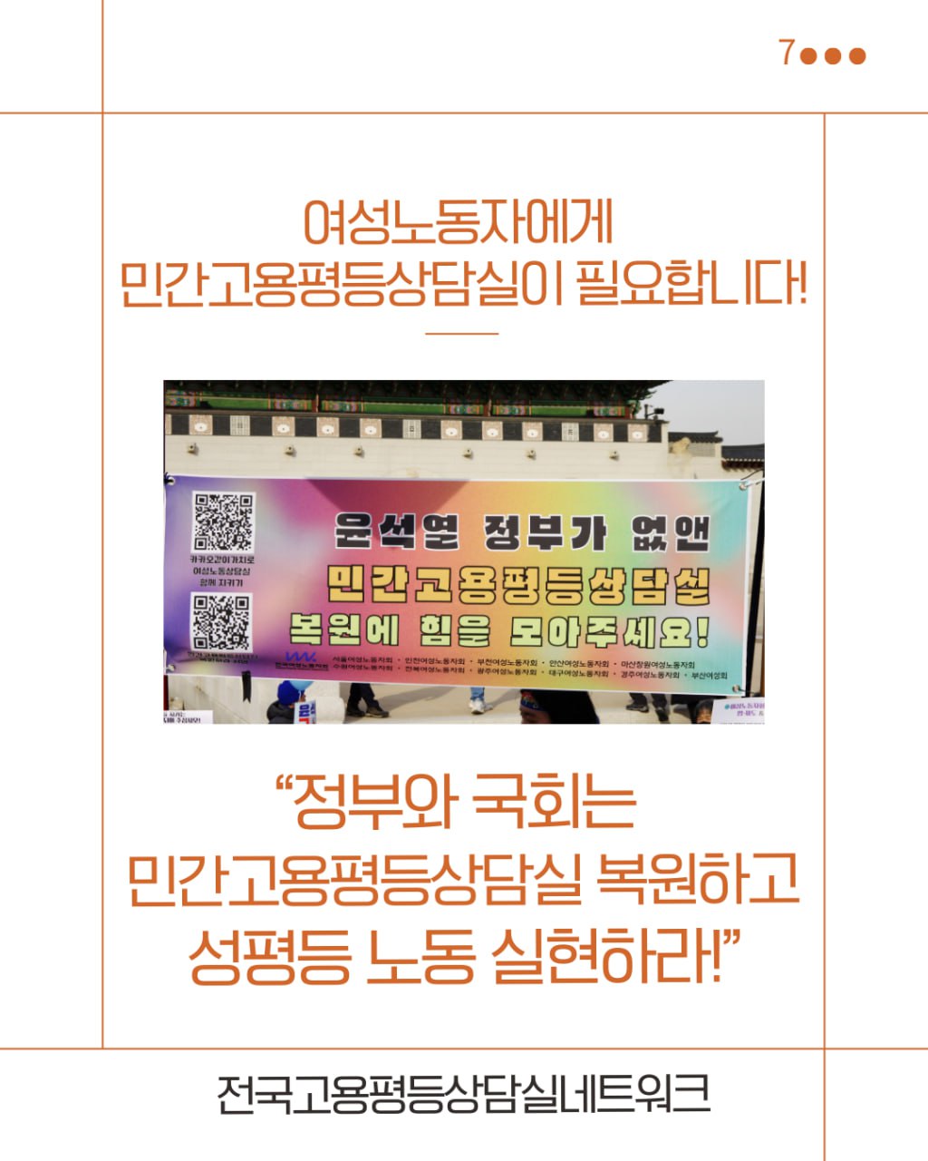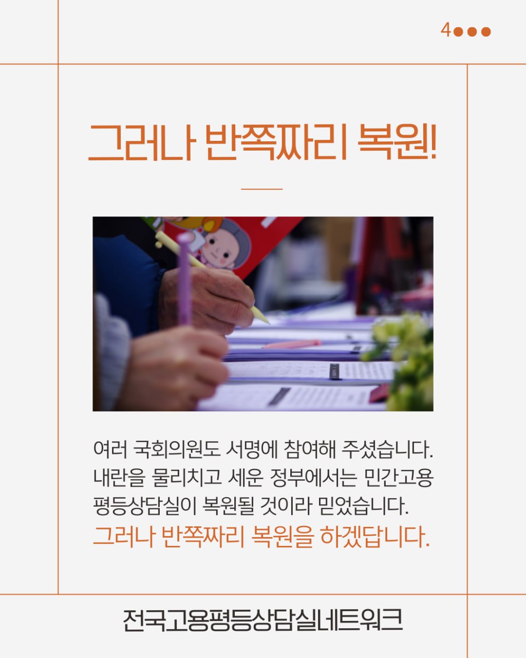여러 국회의원도 서명에 참여해 주셨습니다. 내란을 물리치고 세운 정부에서는 민간고용평등상담실이 복원될 것이라 믿었습니다. 그러나 반쪽짜리 복원을 하겠답니다.
