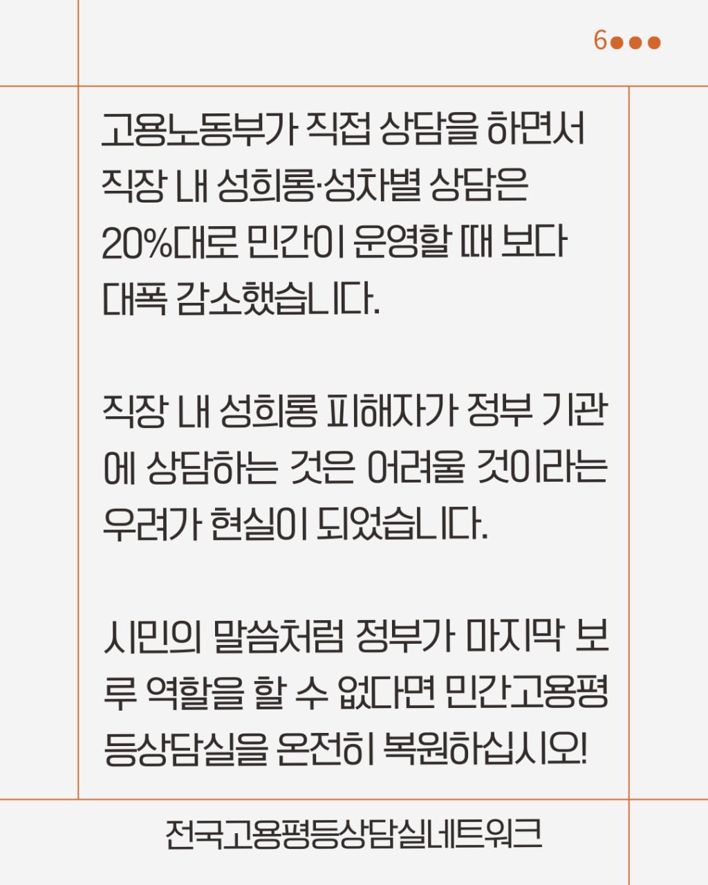 고용노동부가 직접 상담을 하면서 직장 내 성희롱·성차별 상담은 20%대로 민간이 운영할 때 보다 대폭 감소했습니다. 직장 내 성희롱 피해자가 정부 기관에 상담하는 것은 어려울 것이라는 우려가 현실이 되었습니다. 시민의 말씀처럼 정부가 마지막 보루 역할을 할 수 없다면 민간고용평등상답실을 온전히 복원하십시오!