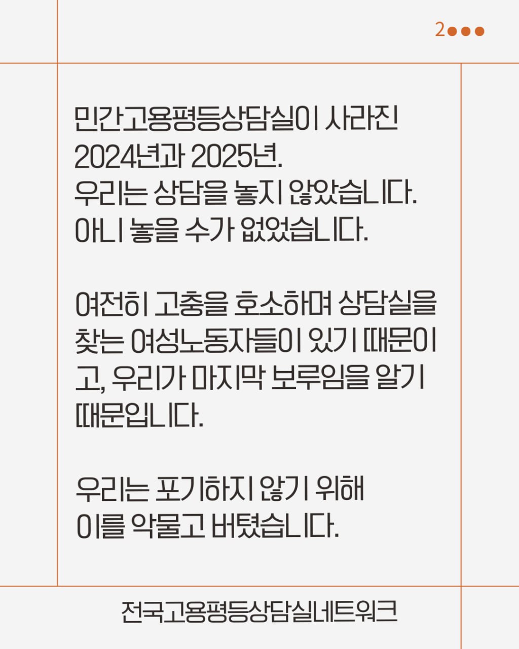 민간고용평등상담실이 사라진 2024년과 2025년, 우리는 상담을 놓지 않았습니다. 아니 놓을 수가 없었습니다. 여전히 고충을 호소하며 상담실을 찾는 여성노동자들이 있기 때문이고, 우리가 마지막 보루임을 알기 때문입니다. 우리는 포기하지 않기 위해 이를 악물고 버텼습니다.