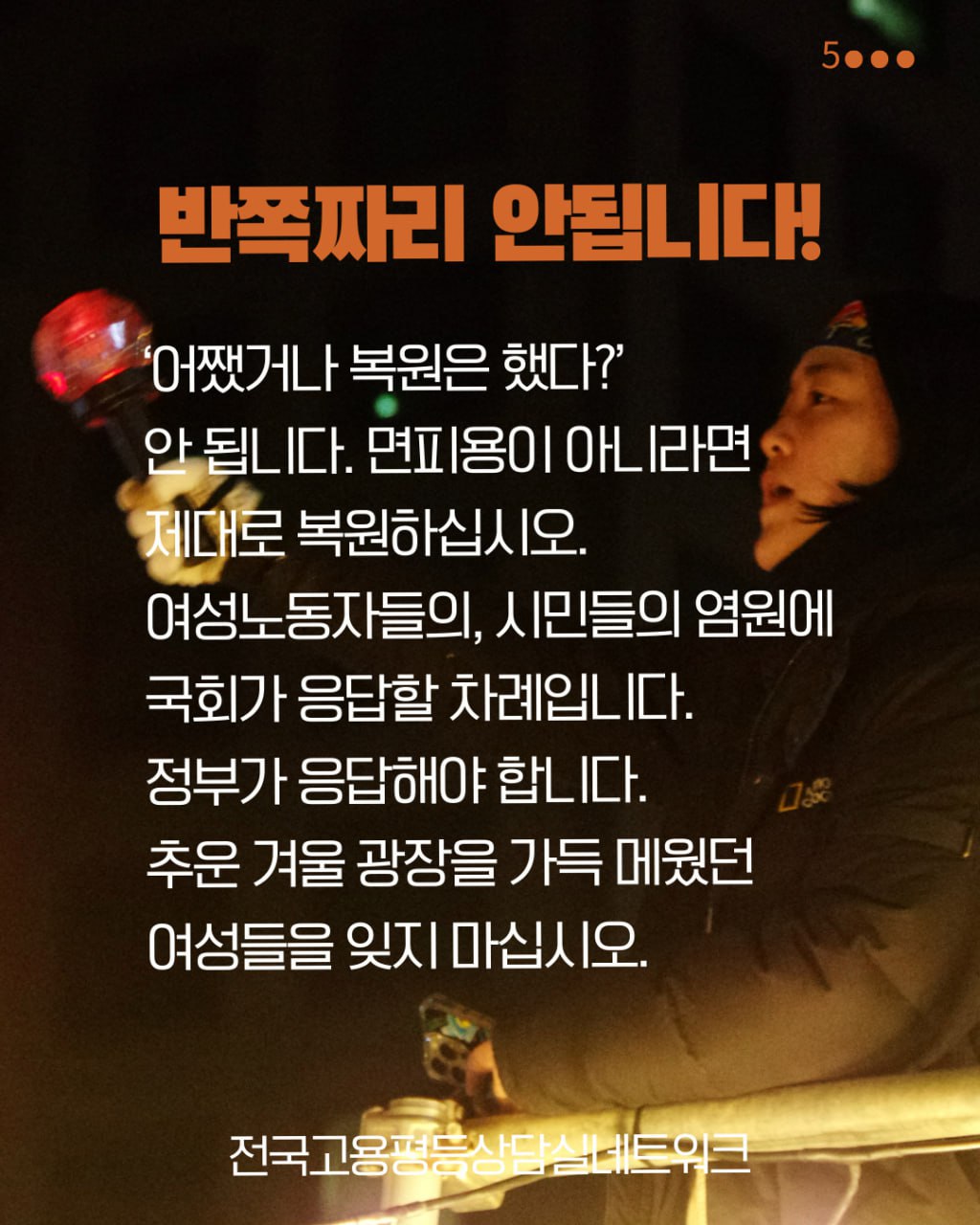 반쪽짜리 안 됩니다. “어쨌거나 복원은 했다?” 안 됩니다. 면피용이 아니라면 제대로 복원하십시오. 여성노동자들의, 시민들의 염원에 국회가 응답할 차례입니다. 정부가 응답해야 합니다. 추운 겨울 관장을 가득 메웠던 여성들을 잊지 마십시오.