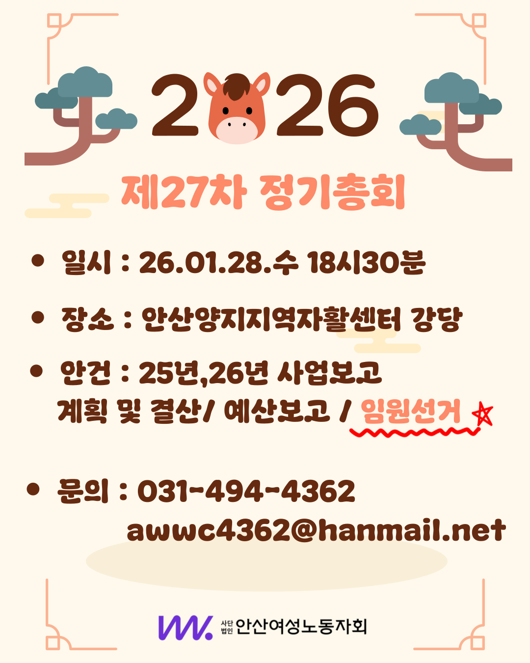 사)안산여성노동자회 제27차 정기총회 공고합니다!