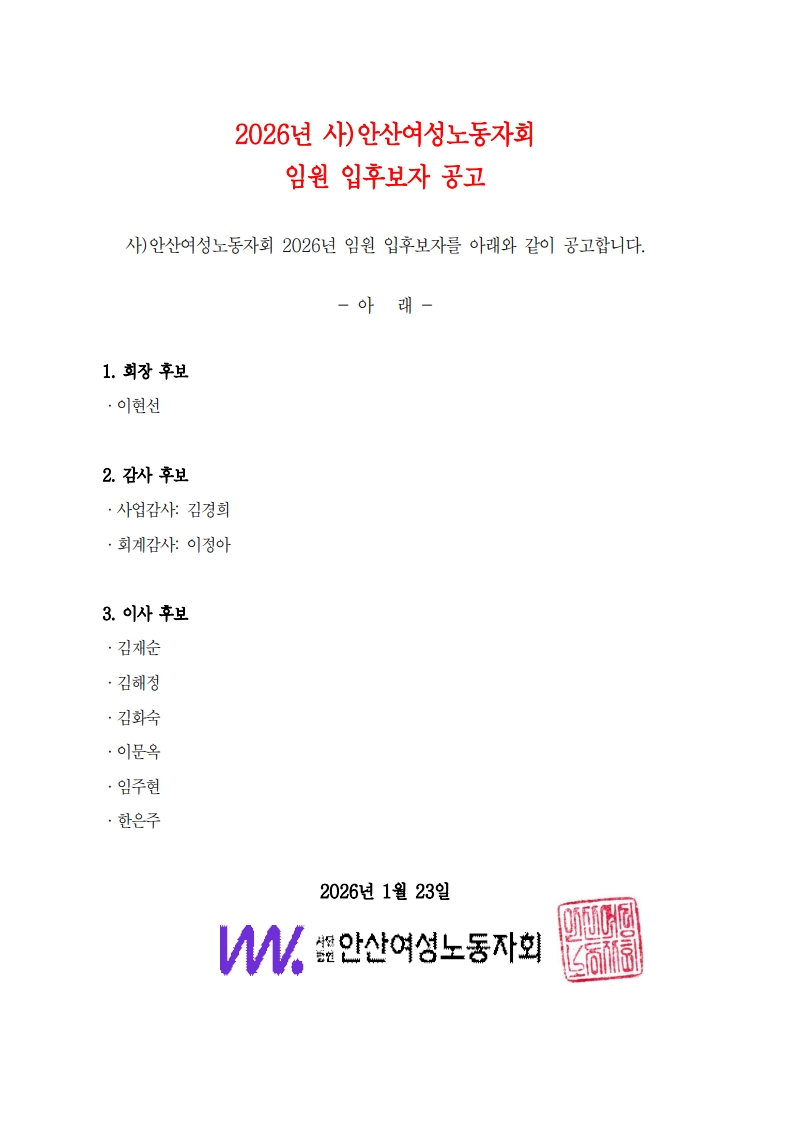 | 사)안산여성노동자회 제27차 정기총회 공고합니다! (0) | 2026.01.23 |