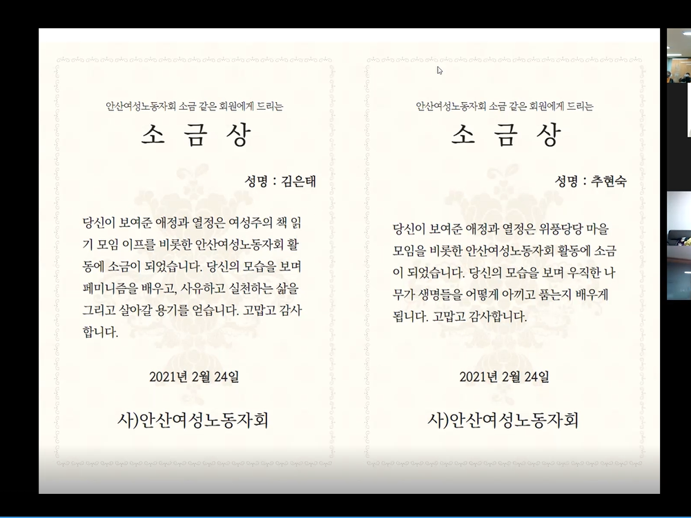 그리고 회원상은 추현숙, 김작가님이 받으셨습니다.