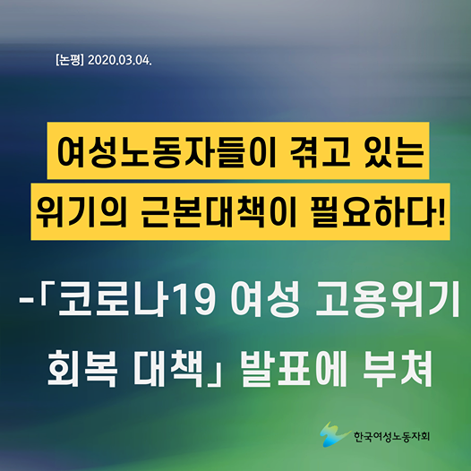 - 금일 발표된 여성고용대책은 코로나19 위기를 맨몸으로 헤쳐 나가고 있는 여성노동자들에게 턱없이 부족하다. 정부는 위기의 근본 원인을 해결할 수 있는 대책을 다시 만들어야만 한다!
