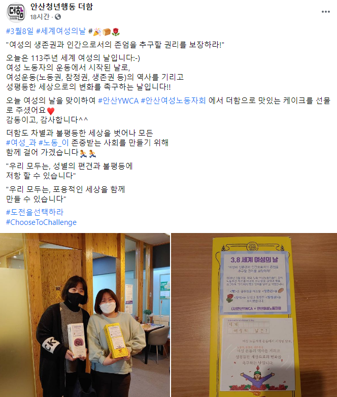 113년 뒤인 2021년 3월 8일, 안산여성노동자회와 안산YWCA도 세계여성의날을 기념하기 위해 20여개 단체를 방문하며 빵을 전달했어요.