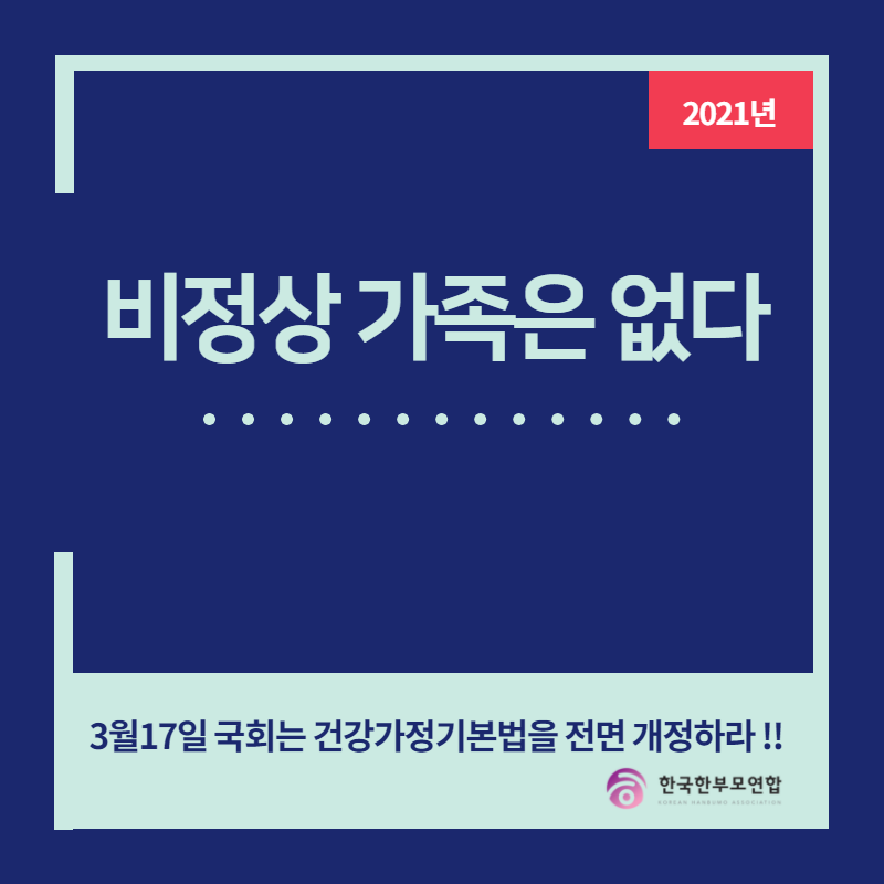 후퇴하고 있는 가족정책을 두고 볼 수 없습니다. 2021년 3월17일 건강가정기본법 전면개정을 통해 성평등한 사회, 성평등한 가족가치를 함께 만들어 갑시다.