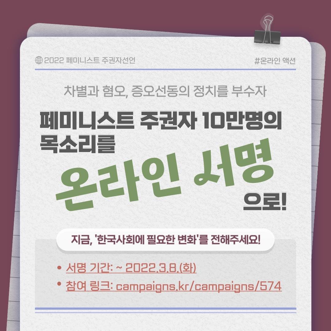 - 페미니스트 주권자 10만명의 목소리를 "온라인 서명"으로!