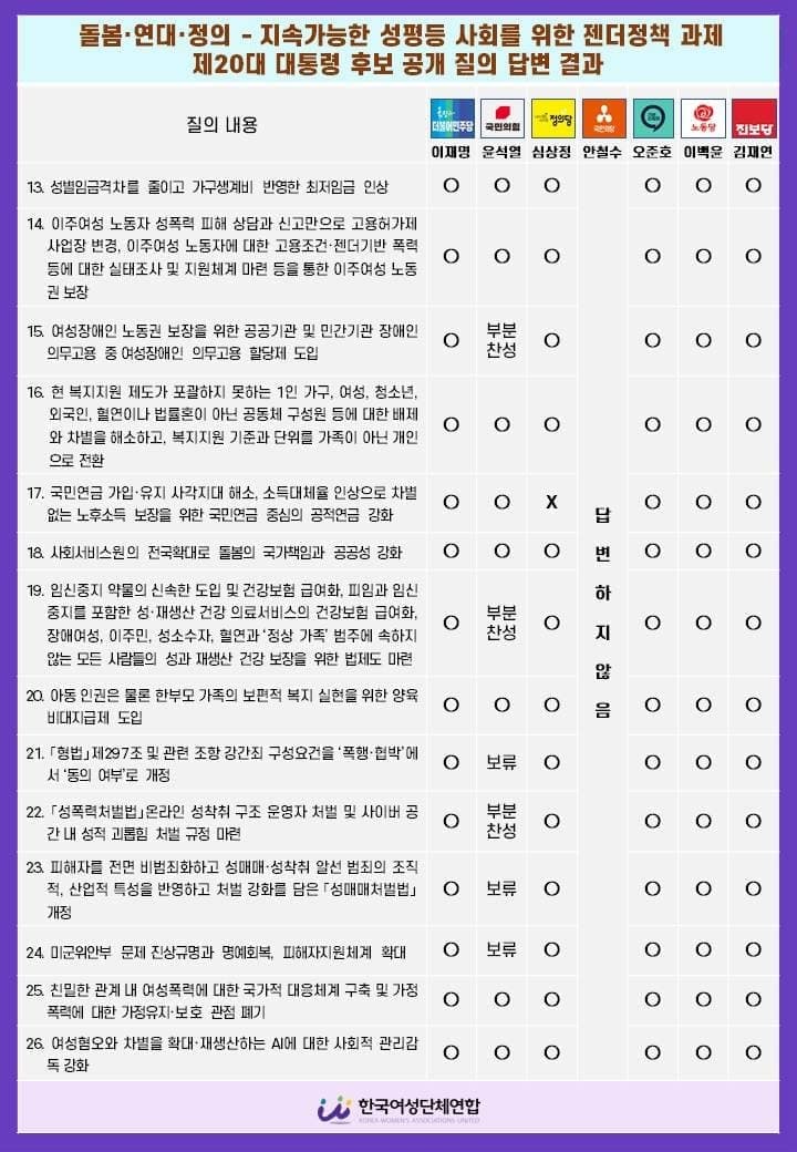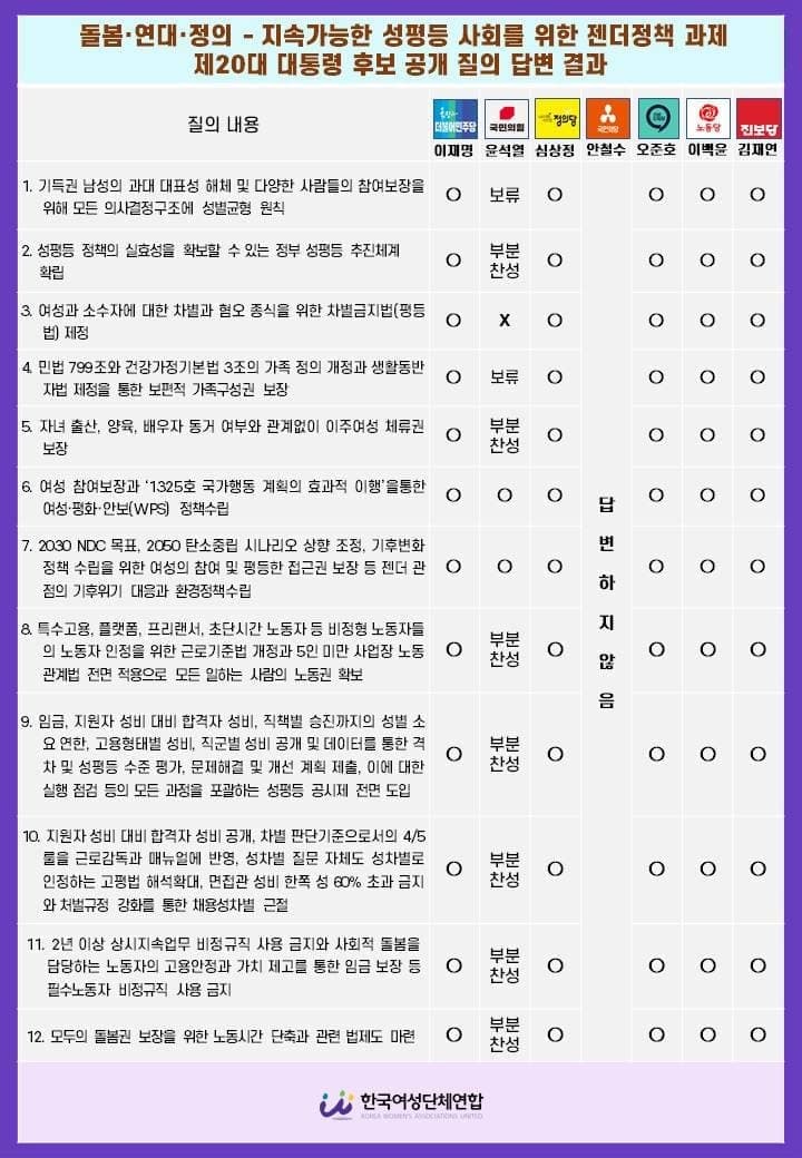 돌봄·연대·정의- 지속가능한 성평등 사회를 위한 젠더정책 과제 제20대 대통령 후보 공개 질의 답변 결과를