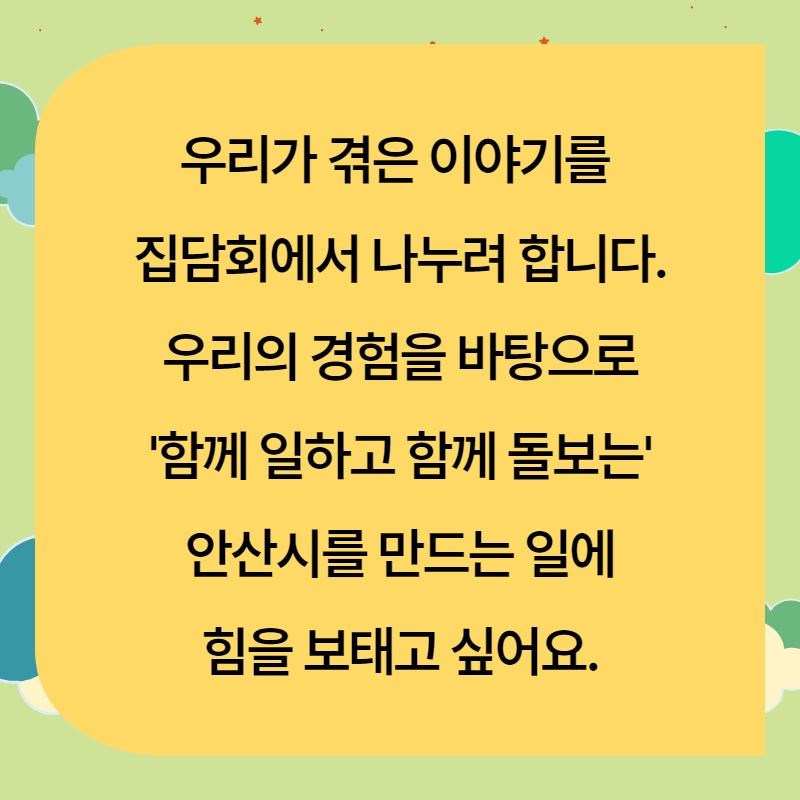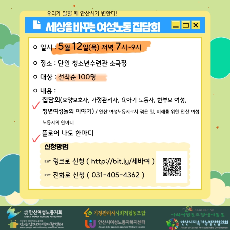 ∨주최·주관 : 안산여성노동자회, 가정관리사사회적협동조합, 사회적협동조합양지돌봄, 안산양지지역자활센터, 안산시여성노동자복지센터, 안산시지속가능발전협의회