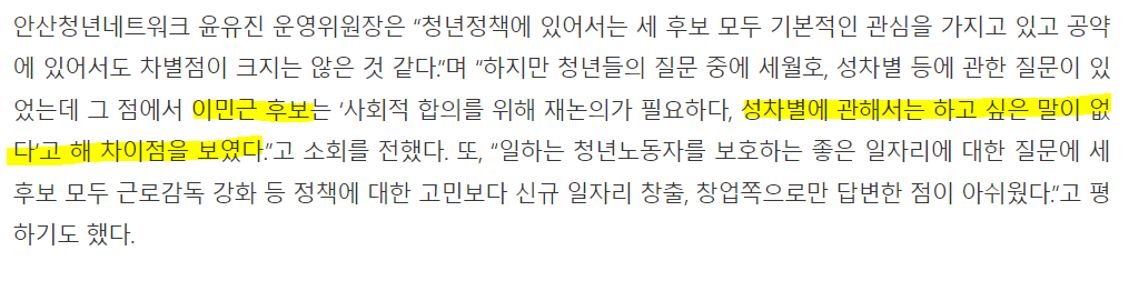 성차별 문제에 대해 고민해보지 않은 것 같은, 생각해보지 않은것 같은 후보자들의 답변이었습니다.