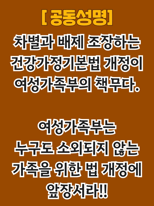 [공동성명] 차별과 배제 조장하는 건강가정기본법 개정이 여성가족부의 책무다. 여성가족부는 누구도 소외되지 않는 가족을 위한 법 개정에 앞장서라!!
