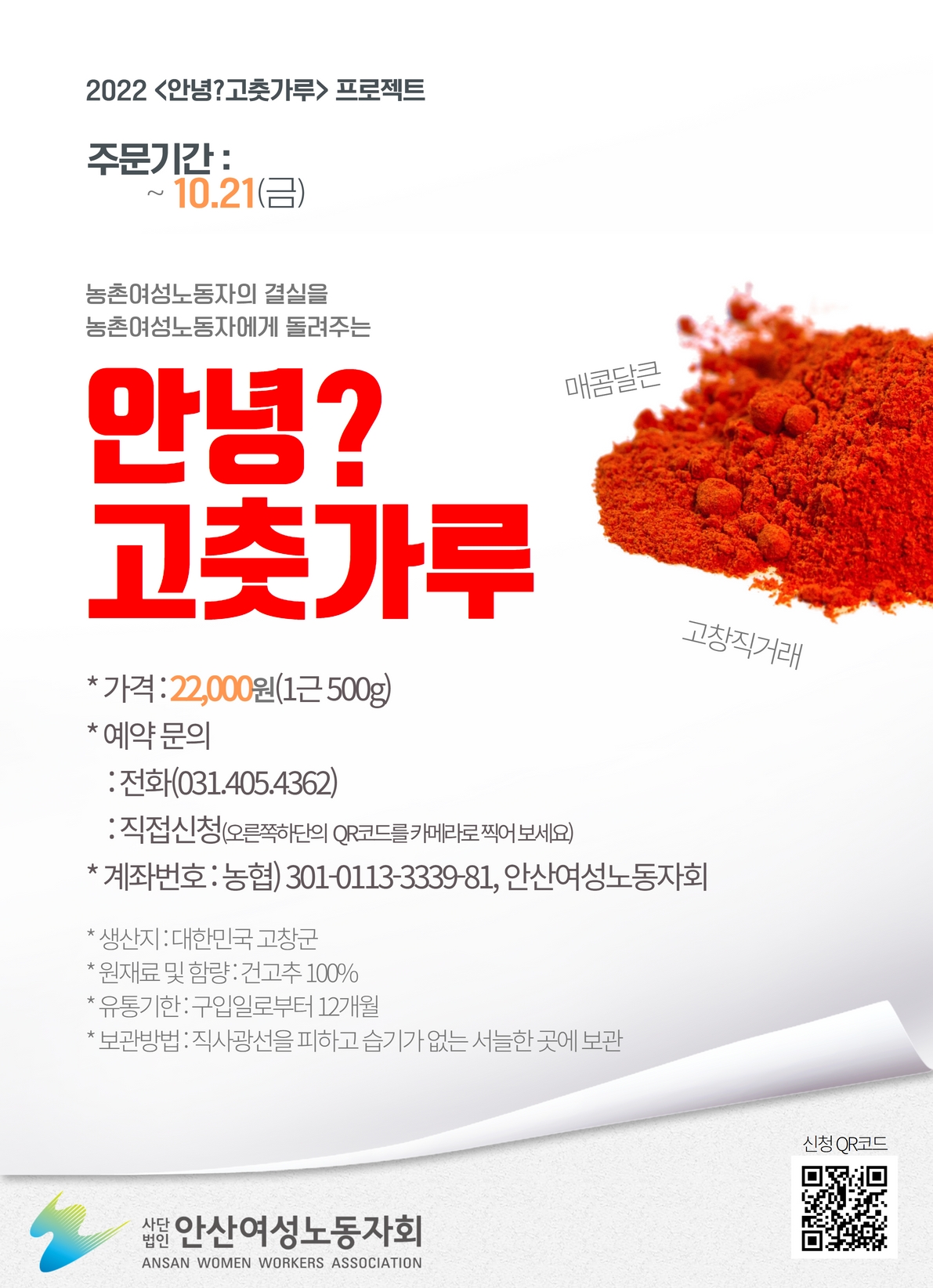 농촌 여성노동자의 결실을 농촌 여성노동자에게 고스란히 돌려주는 안녕? 고춧가루 프로젝트에 후원해 주세요.
